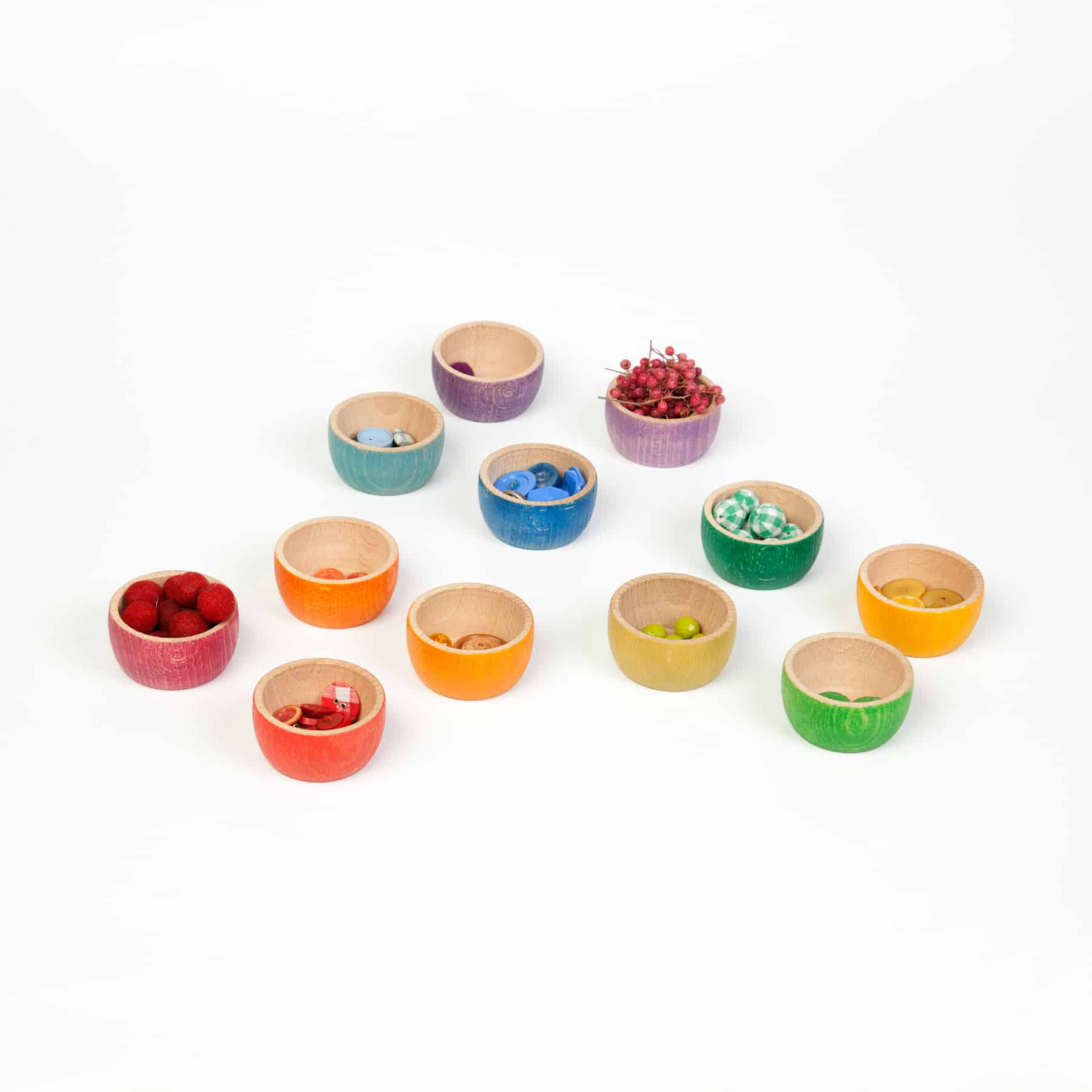 Pour trier ou dans un jeu symbolique, ces 12 bols colorés en bois de Grapat sont de taille idéale pour les mains de vos minis!