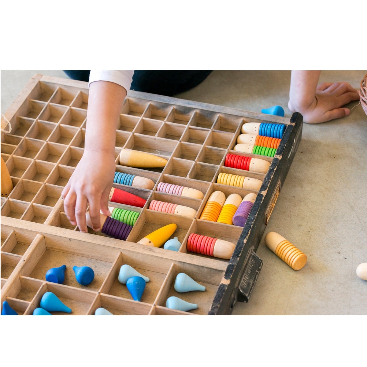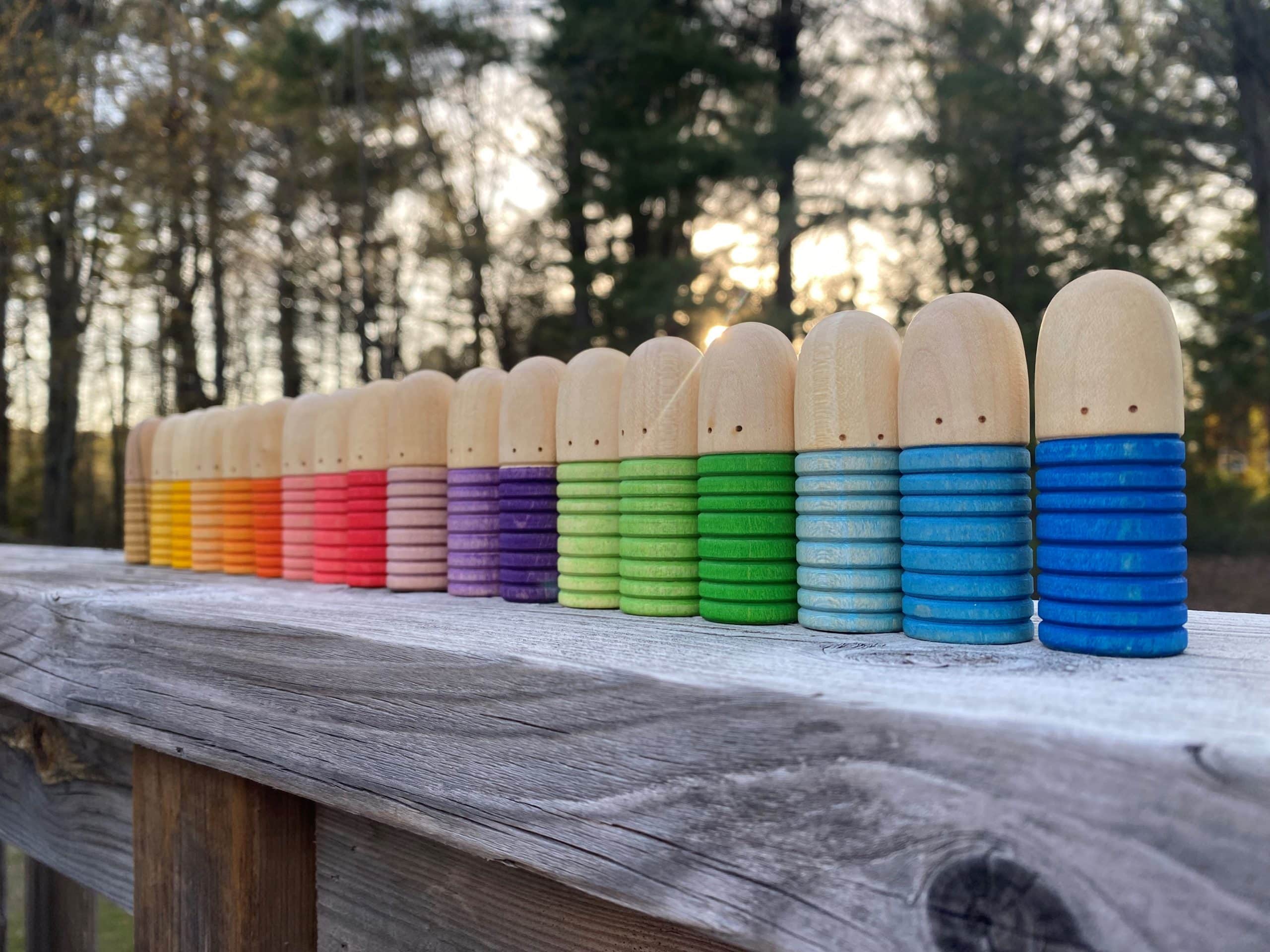18 Copains en bois (brots) de Grapat sont de jolis personnages offerts en 18 différentes couleurs! C’est le fait de les toucher et de les manipuler qui vous fera tomber en amour avec eux, vous aussi! Leur tête est lisse et arrondie, alors que leur corps et texturés, offrant une variété de textures pour répondre aux besoins sensoriels des enfants. Leur taille les rend sécuritaires 10 mois et +, ce qui les rend encore plus merveilleux! Ces 18 copains pourront grandir avec les enfants et ainsi évoluer à travers leurs jeux et explorations. Comme les « brots » n’ont ni identité ni personnalité prédéterminée, ils pourront servir de superhéros, d’animaux, de personnages imaginaires ou de n’importe quoi d’autre dans les scénarios des enfants! Il est même possible de les utiliser pour construire, s’en servant comme piliers pour une construction, comme décoration d’une tour ou encore pour créer des mandalas. Leur polyvalence offre l’option de s’en servir pour travailler le dénombrement et la correspondance 1 à 1, pour découvrir les couleurs, trier, aligner et plus encore!