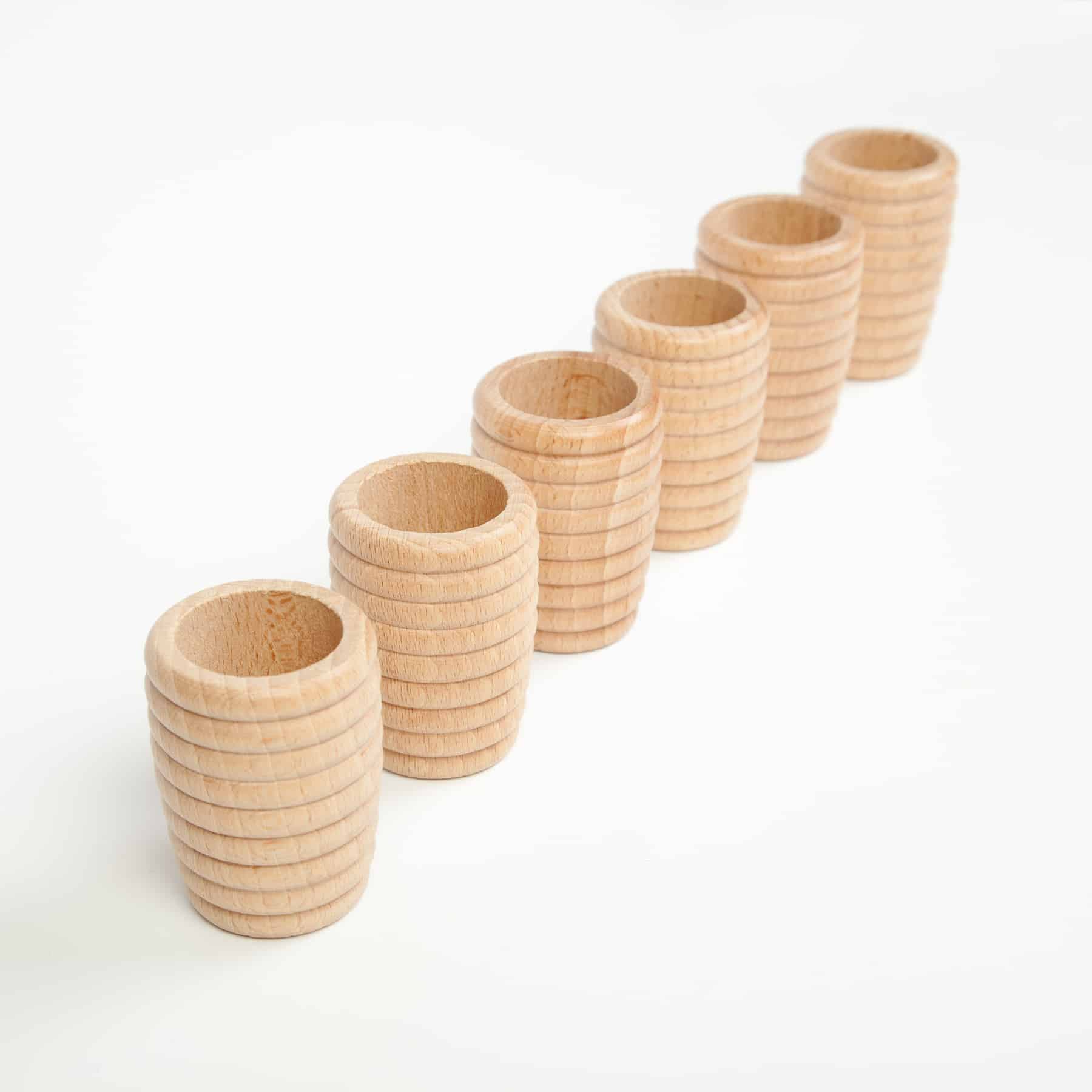 Ces 6 pots en bois naturel texturé de Grapat nous rappellent les ruches ou encore les nids d’abeilles. Ils sont parfaits pour les petites mains et sont sécuritaires dès la naissance. Leur format est tout désigné pour les personnages en bois Grapat et Grimm’s qui s’insèrent à merveille dedans. Ces pots sont idéaux pour classer, trier ou empiler et s’inscrivent merveilleusement bien dans le mode de pensée du jeu libre et ouvert. Ils pourront à la fois servir pour créer des tours, en guise de jeu de quilles avec des balles ou des ballons, pour remplir et vider, comme verres dans les jeux de rôles, comme parcours d’obstacles pour les voitures, pour décorer l’environnement de jeu, etc. Les opportunités sont aussi grandes que l’imagination des enfants! Dans un bac sensoriel, ces pots pourront accueillir toutes sortes de petites merveilles! Les enfants pourront s’amuser à les remplir et è les vider…à l’infini!