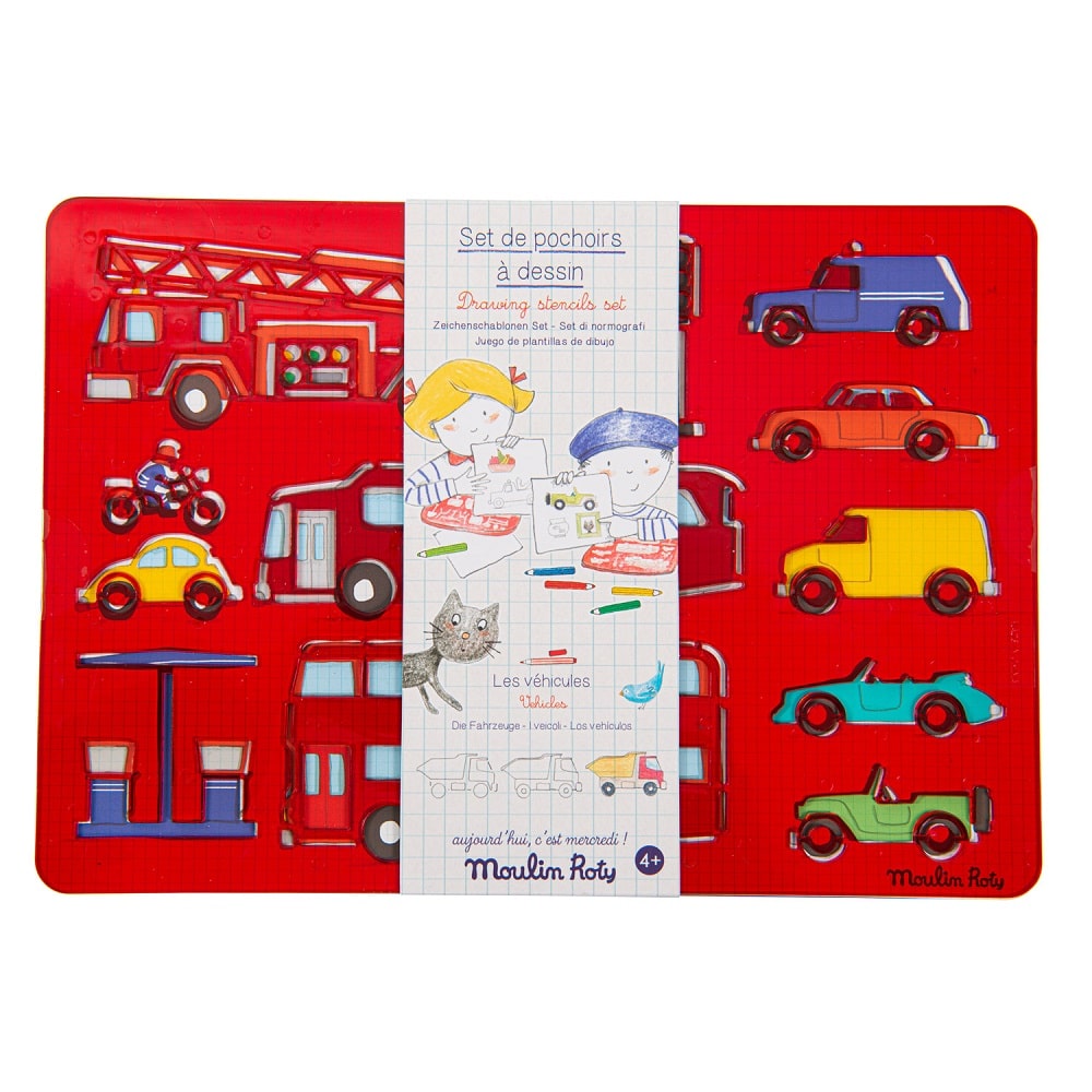 Sous le thème des véhicules, cet ensemble de deux pochoirs à dessin permet de reproduire toutes sortes de véhicules : motos, voitures, autobus et camions.