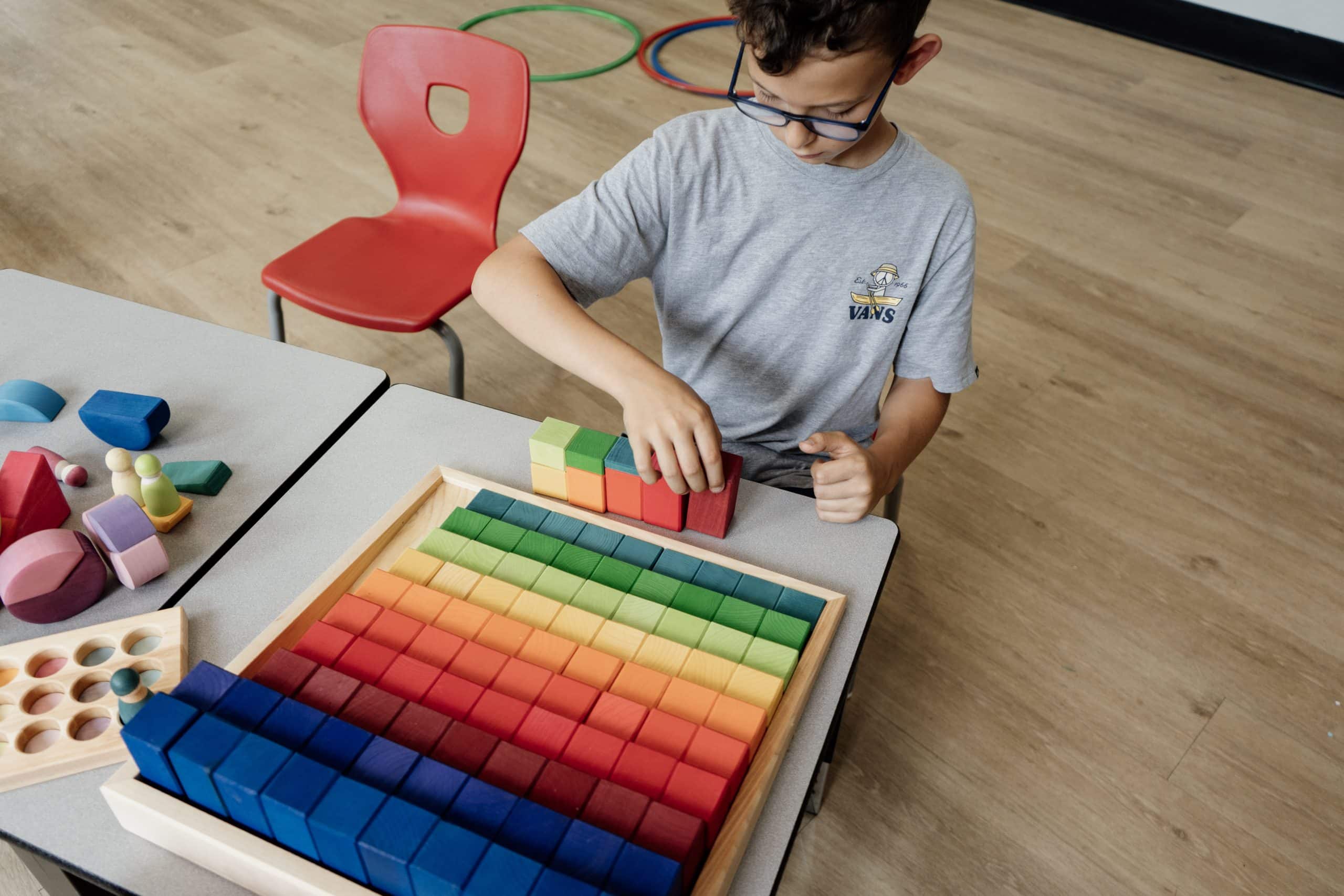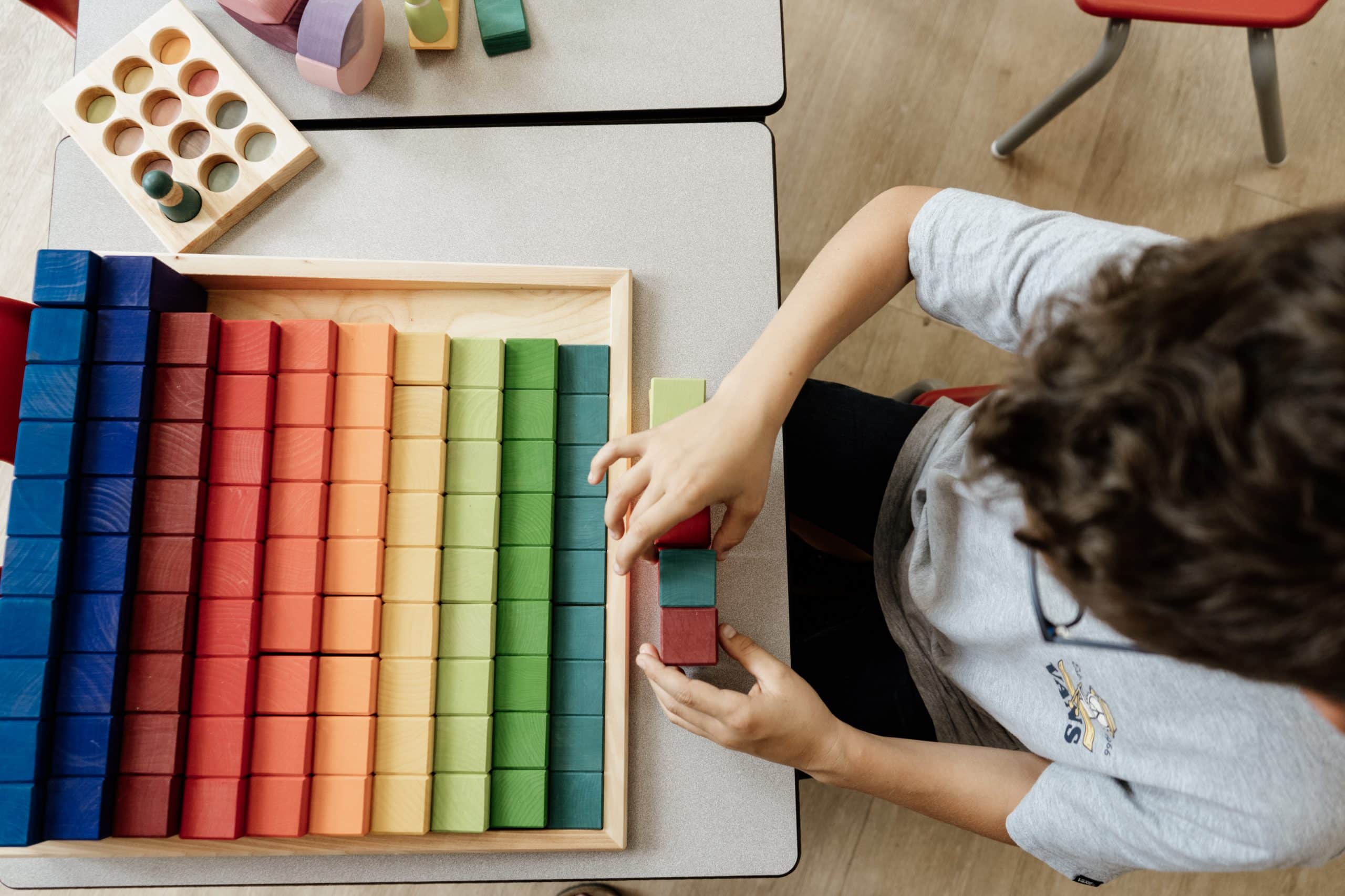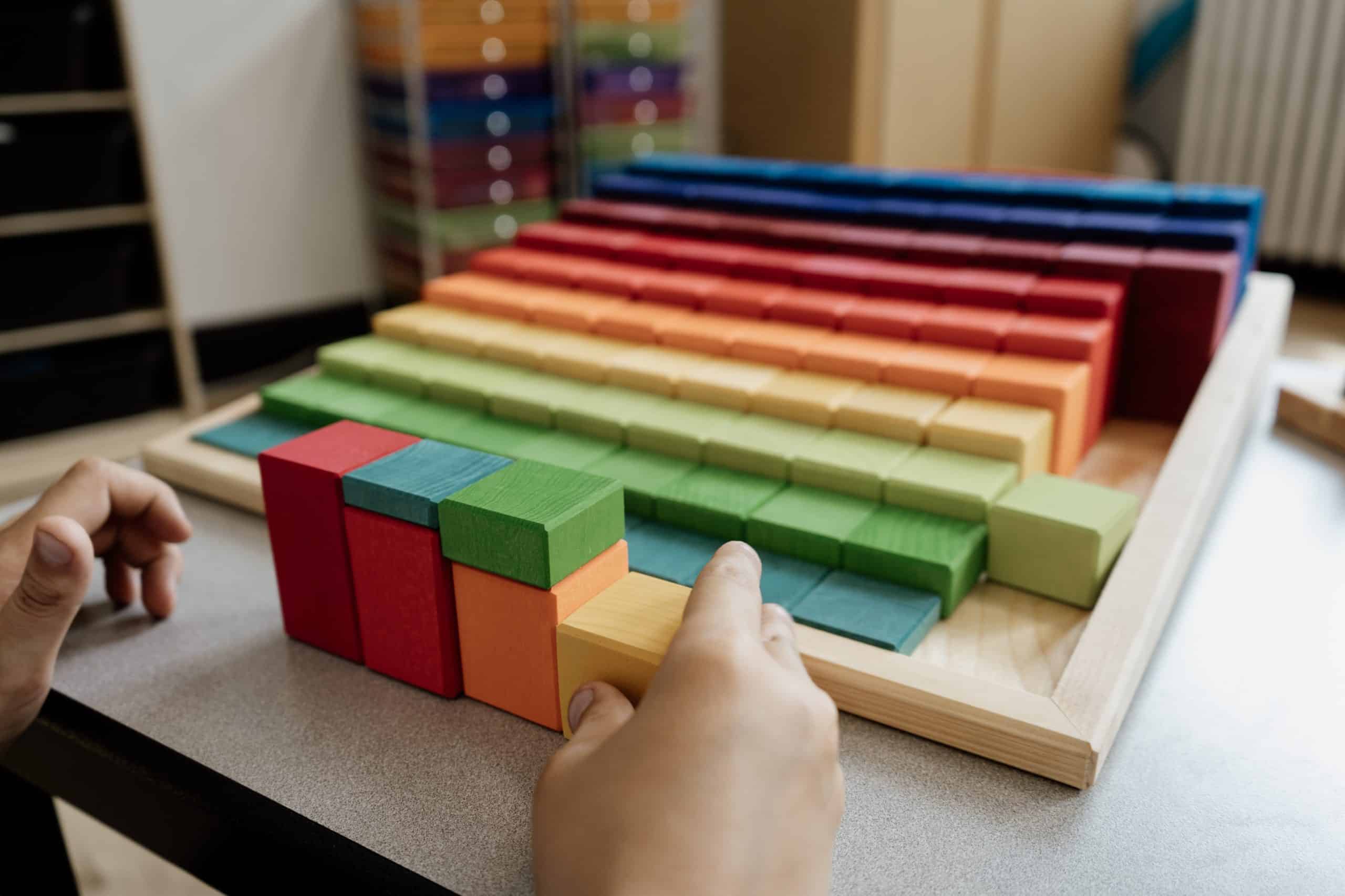 Explorez le monde des mathématiques grâce à ces 100 blocs de calcul de très grand format de Grimm’s! Explorez les proportions et développez la pensée spatiale avec ce bel ensemble. Les blocs de construction mesurent de 1 cm à 10 cm de hauteur. Les enfants pourront visualiser les rapports numériques en comparant les blocs.