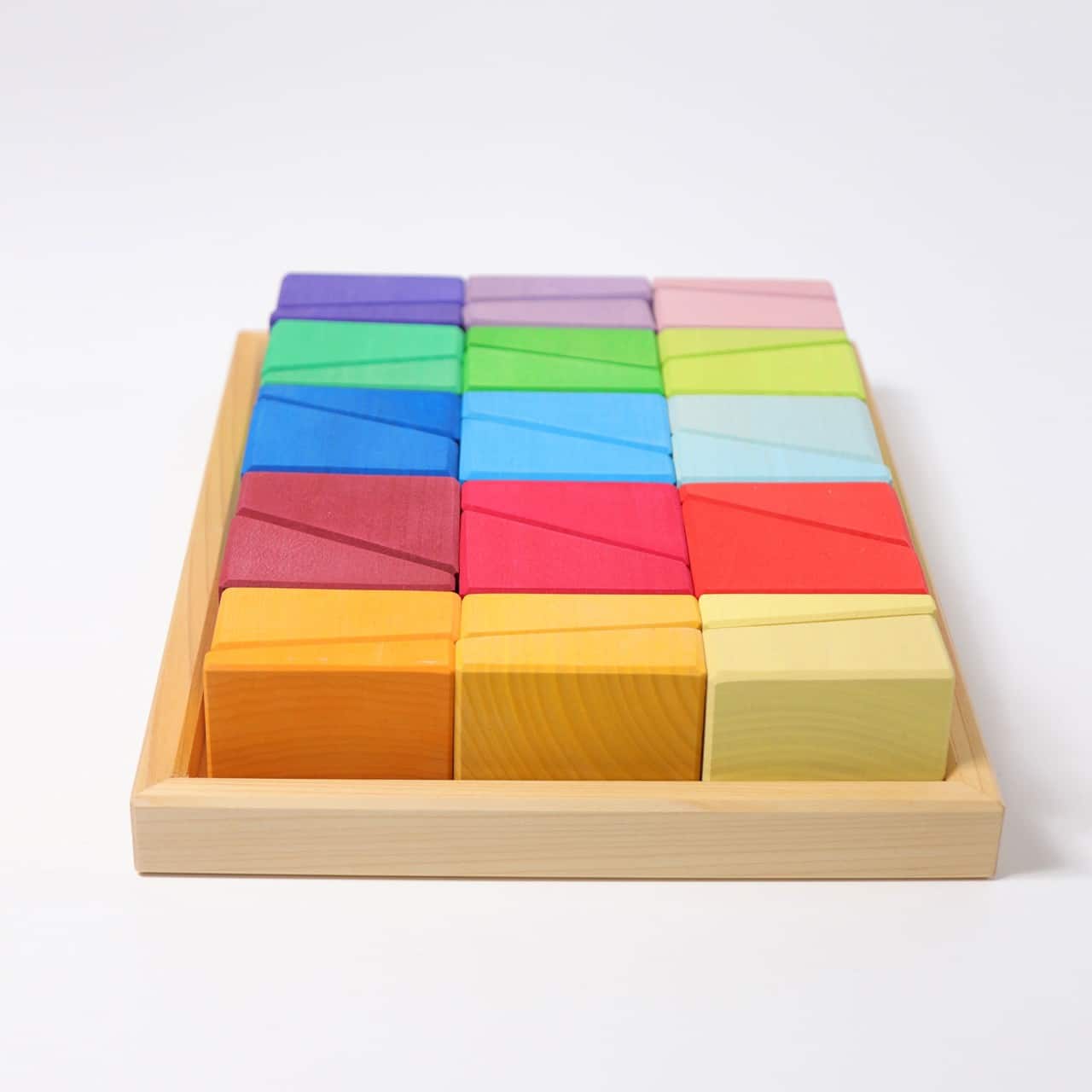 Ces jolis blocs colorés sont inclinés et invitent les enfants à construire de manière plus complexe et variée. Créez des rectangles en associant les couleurs identiques. Les 6 blocs d’une même nuance de couleur (bleu/rouge/vert/jaune et violet) ont le même angle d’inclinaison et complèteront donc également un rectangle. En construisant et en jouant avec les blocs inégaux, les enfants développent leur motricité fine et leur capacité de réflexion spatiale. Les blocs inclinés sont un ajout intéressant aux parcours de balles! Créez des constructions qui sortent de l’ordinaire avec cet ensemble de blocs inclinés. Jumelez-les à votre matériel polyvalent pour offrir des opportunités encore plus diversifiées! Ce type de blocs invite au mouvement.