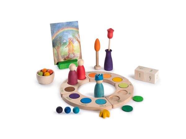 Le Calendrier hebdomadaire coloré en bois – 7 lunes – de Grapat contient 7 personnages glands en 7 couleurs qui sont associés à chaque jour de la semaine selon la pédagogie Waldorf, 7 récipients et 1 plateau rond (18 cm de diamètre) sur lequel sont placés les éléments. Il constitue un matériel tout désigner pour expérimenter le rythme cyclique hebdomadaire. Les enfants associeront chaque jour à leur couleur et pourront ainsi comprendre le passage des jours. De nombreuses cultures anciennes croyaient que chaque jour de la semaine avait sa propre planète, sa propre couleur, son parfum et son grain. Ensuite, ces idées ont été appliquées par les pédagogies Waldorf. Lundi : lune, riz, violet ou violette, jasmin. Mardi : Mars, rouge, orge, clou de girofle. Mercredi, Mercure, millet, jaune, copal. Jeudi, Jupiter, seigle, orange, cèdre… Vendredi : Vénus, avoine, vert, rose Samedi : Saturne, maïs, indigo ou bleu, myrrhe. Dimanche : soleil, blé, blanc, encens. Pour compléter ce calendrier, Grapat a créé le Dear Universe (GRA24255) qui permet de combiner les différents jours de la semaine avec les planètes de notre système solaire.