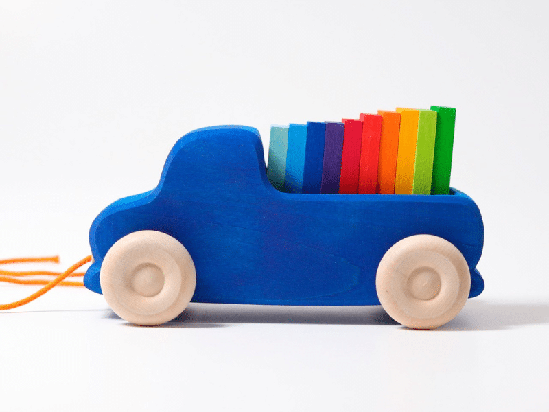 Ce camion bleu à tirer de Grimm’s comprend 10 blocs aux couleurs de l’arc-en-ciel. Promenez-le partout en le tirant par la corde. L’enfant pourra s’amuser à vider et remplir le camion avec les blocs inclus. Ces blocs pourront être utilisés pour construire, empiler, aligner, créer des tours, nommer les couleurs et plus encore! Pourquoi ne pas y ajouter des personnages ou encore des animaux pour ajouter une autre dimension au jeu du tout-petit. Ce camion à tirer encouragera l’enfant à se déplacer dans l’espace et à utiliser la corde (ou non!) pour le faire avancer. Fera-t-il le bruit du camion en le faisant rouler?