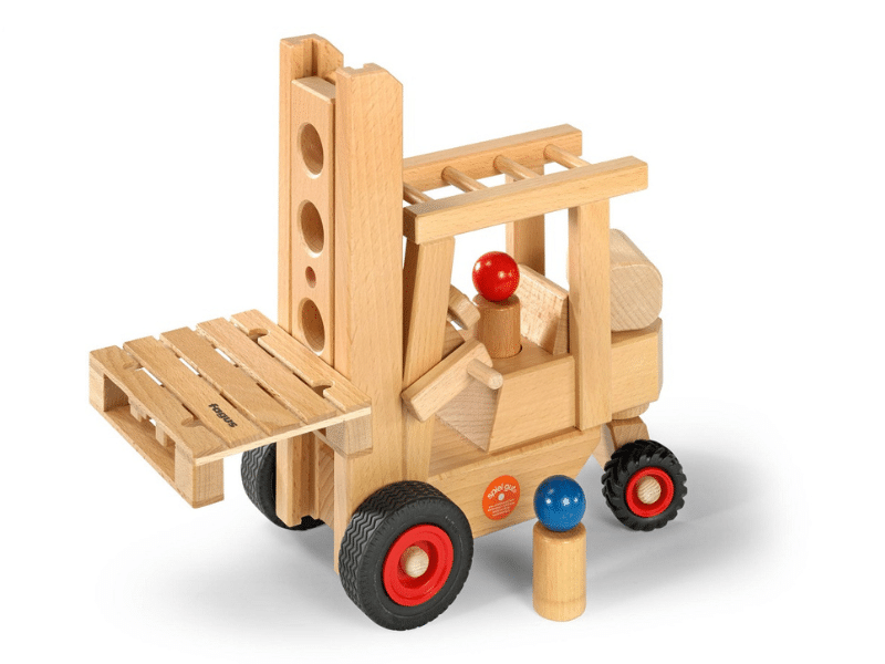 Le chariot élévateur en bois de Fagus comprend 2 personnages ainsi qu’une palette à soulever. Il est facilement dirigeable grâce à ses roues arrières pivotantes. Amusez-vous transporter la palette d’un endroit à l’autre. Aurez-vous le courage d’y mettre des choses dessus avant de la transporter avec le chariot élévateur? Serez-vous capable de tout garder en place, sans rien faire tomber? Tout est une question de réflexes, de précision et d’équilibre! Quelle belle manière d’explorer les lois de la gravité et de faire un peu de science! Lequel des 2 conducteurs sera le plus compétent pour transporter le chargement?