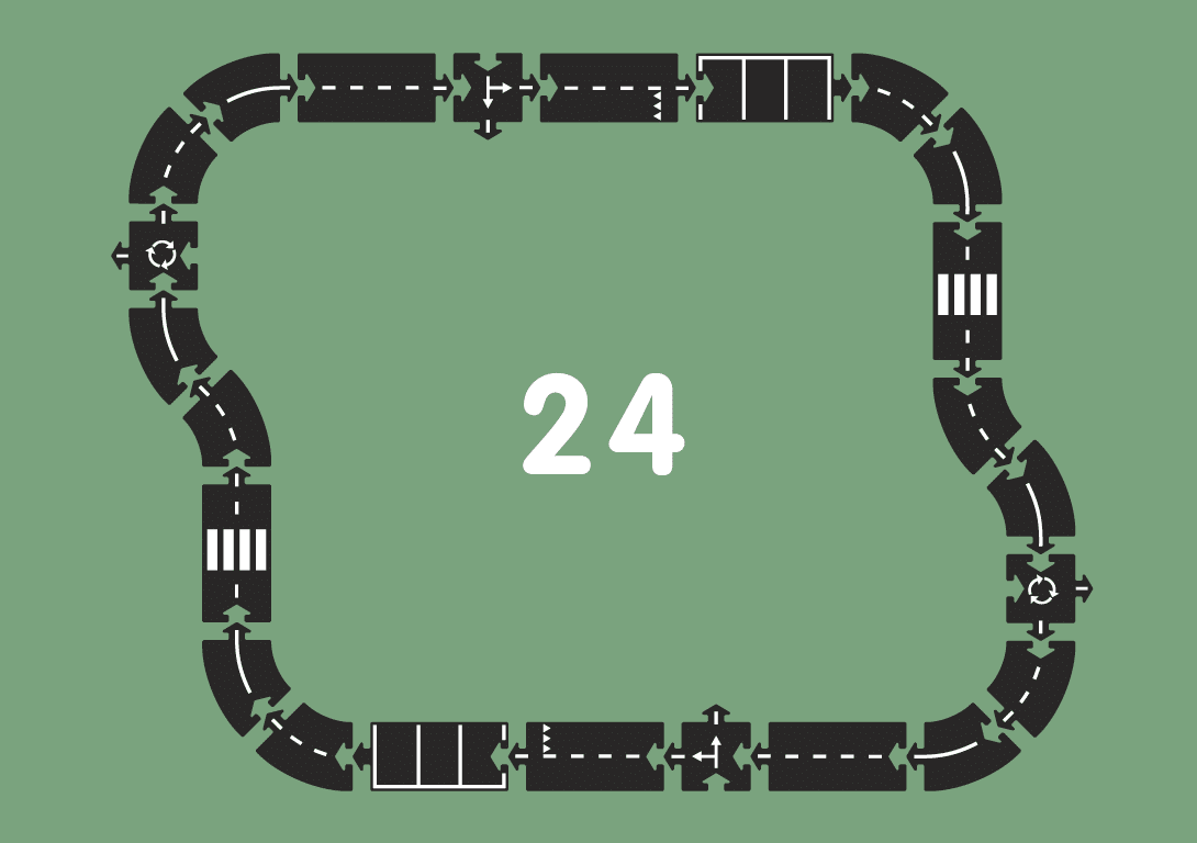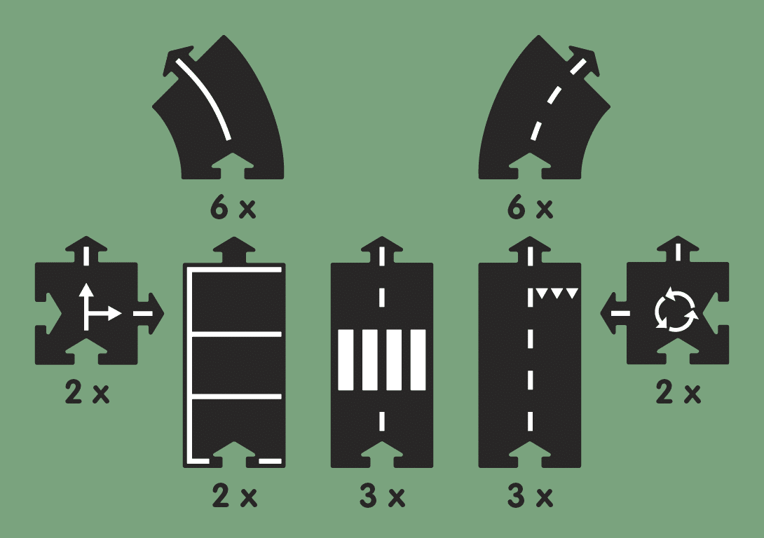 Comprend 12 virages, 8 lignes droites, 2 intersections et 2 ronds-points pour un total de 376 cm de long une fois assemblé.