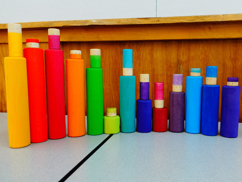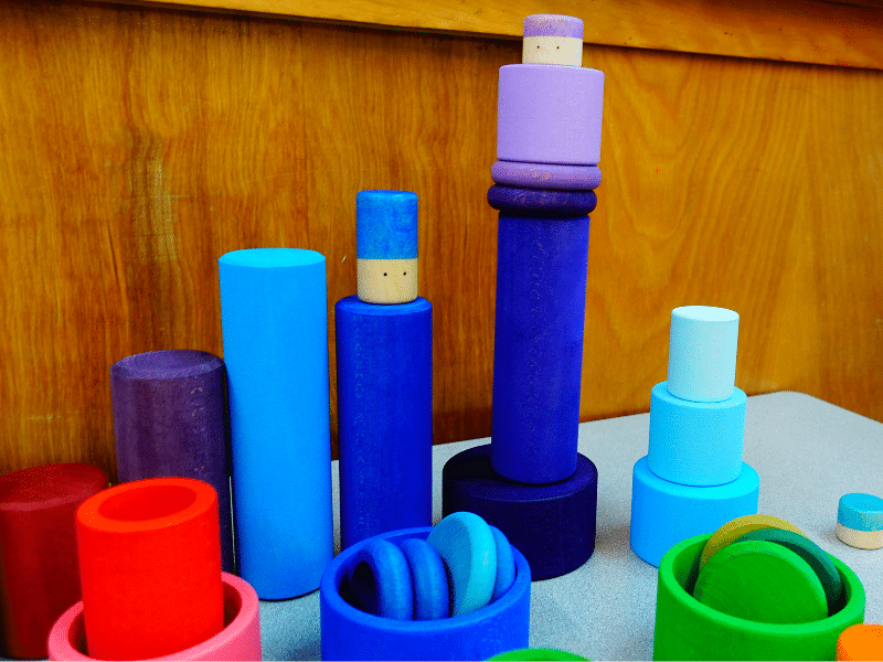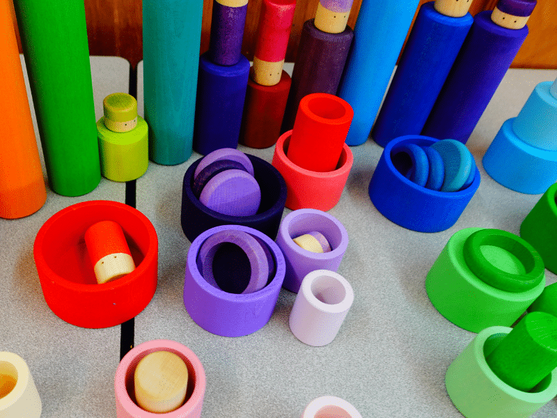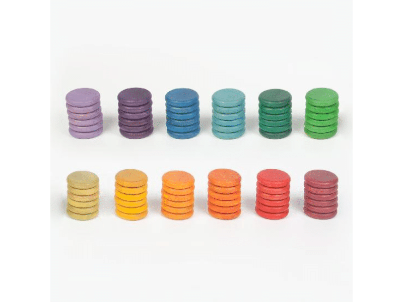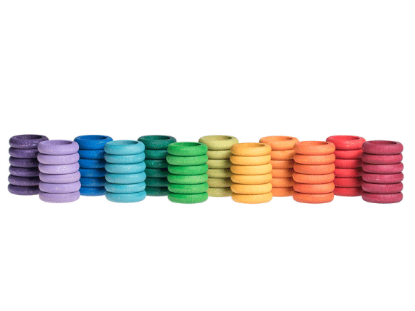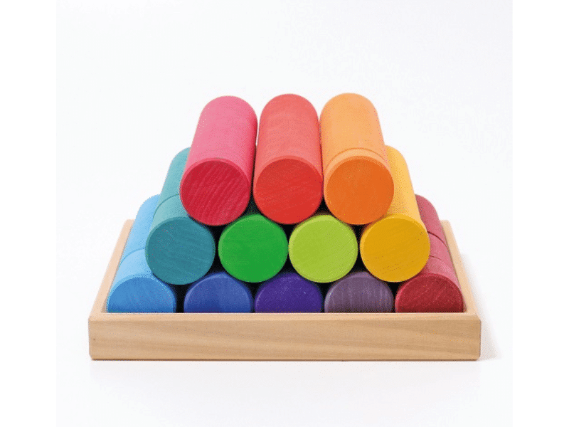 Les 24 bols empilables invitent au tri par ordre de grandeur tout autant que par couleur. L’enfant pourra observer les différentes teintes d’une même couleur. Qu’il s’amuse à les mettre les uns dans les autres, comme des gobelets gigogne ou encore en les superposant pour créer des tours, le plaisir sera au rendez-vous! Les bols pourront servir de cachettes aux Lola, accueillir des pièces ou des anneaux colorés ou n’importe quelles « loose parts »! Placés à l’envers sur les cylindres de tri, les bols seront utiles pour créer des arbres, des champignons ou toute autre structure.