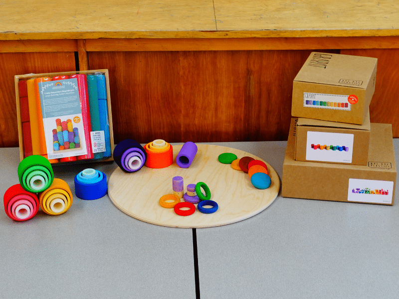 Comme son nom le dit, ce Coffret découverte est rempli de couleurs! Il met de l’avant les différentes couleurs de l’arc-en-ciel et a été conçu pour valoriser l’orientation spatiale dans les jeux des enfants. Amusez-vous à découvrir les notions d’espace avec ce matériel de jeu ouvert et polyvalent! Avec ce coffret, vous pourrez stimuler les concepts liés à l’orientation spatiale avec les enfants, comme « dedans », « dehors », « sur », « sous », « à côté », « derrière », « devant », « entre » (ou « au milieu »), « au-dessus », « en-dessous », « en haut », « en bas » et éventuellement « à droite » et « à gauche ». Entre18 mois et 2 ans, l’enfant comprend certains mots simples liés à l’espace. Entre 3 et 5 ans, l’enfant est habituellement en mesure de comprendre et d’utiliser des mots d’orientation spatiale dans son discours. Ce coffret est donc un bon moyen d’accompagner les enfants dans ces apprentissages et de leur offrir du matériel adapté afin qu’ils puissent investir dans leur propre développement langagier et cognitif, en manipulant et en utilisant eux-mêmes ces termes. Plus les enfants les entendront, plus ils viendront à les comprendre et à les répéter dans un contexte approprié. Ça leur permettra d’ajouter du vocabulaire dans leurs phrases et de les complexifier. Les mots ayant un lien avec l’orientation spatiale viennent bonifier le discours oral de l’enfant et, éventuellement, lui viendront en aide lors de l’apprentissage de la lecture et de l’écrite, où l’image mentale est sollicitée. La compréhension et l’utilisation de ces termes sont des éléments importants qui viendront le supporter dans la compréhension d’un texte ou pour l’écriture d’un texte qui a du sens.
