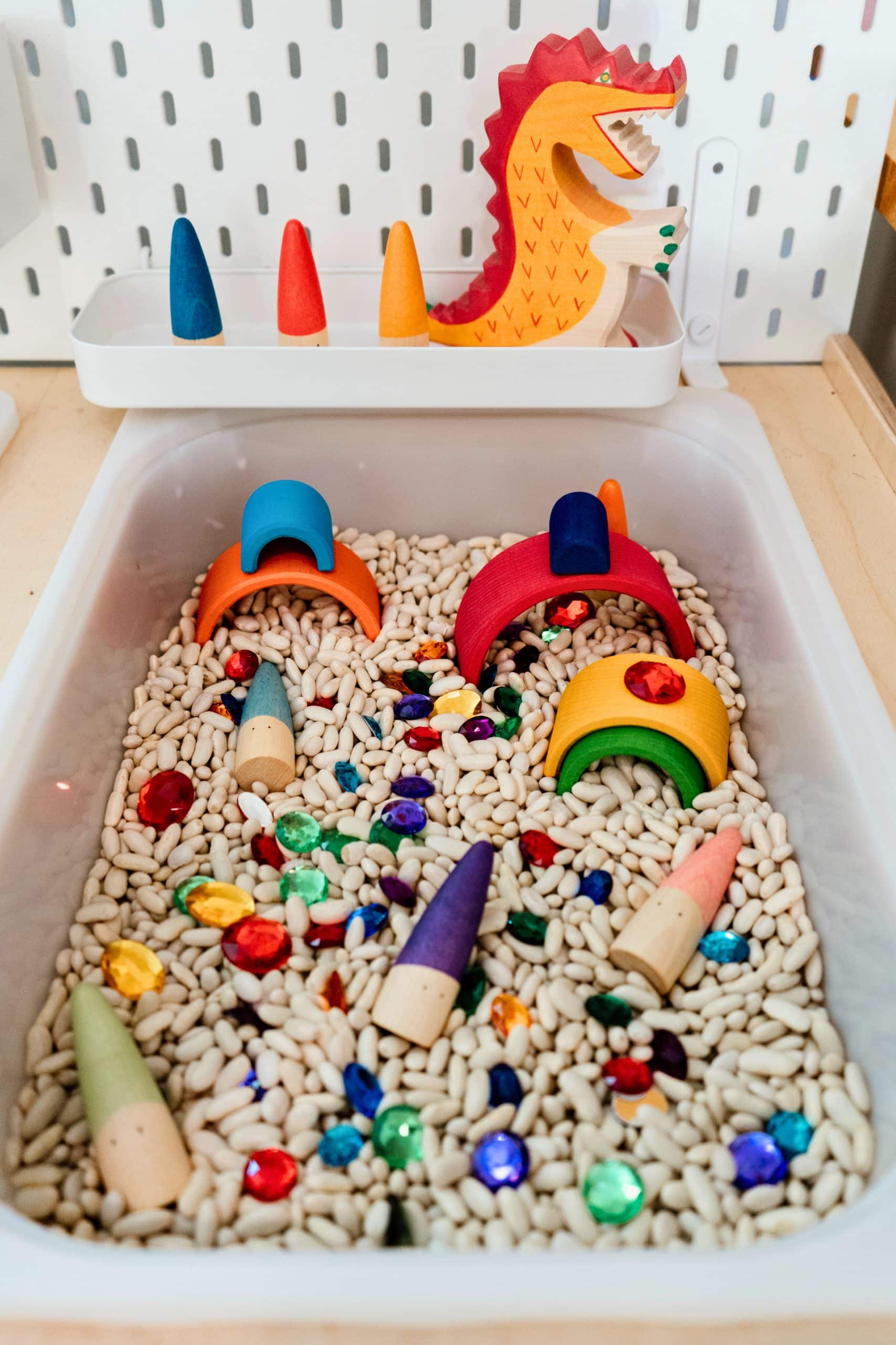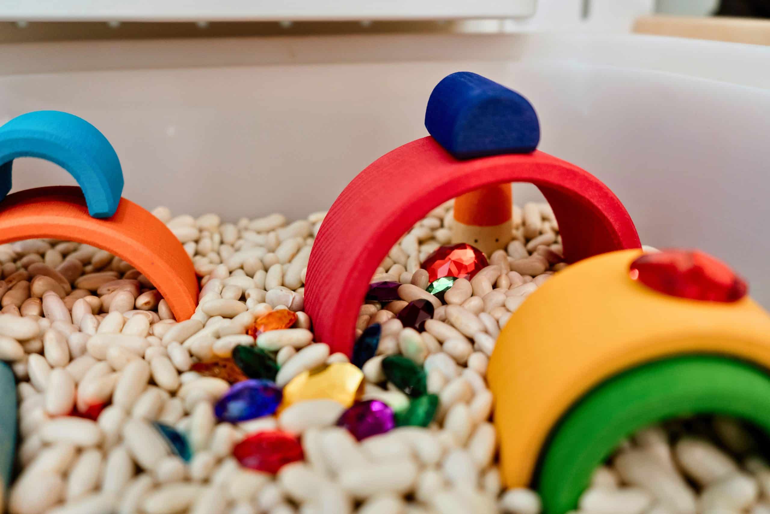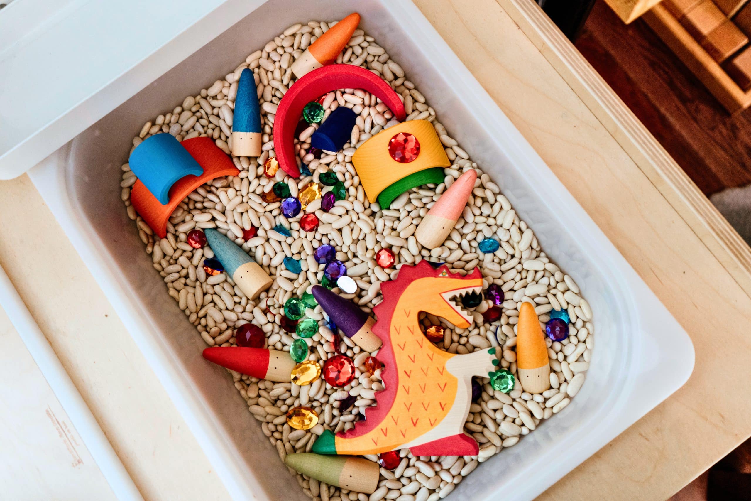 Nous avons créé ce coffret afin que son contenu puisse être intégré dans un bac sensoriel. Imaginez ces jolis jouets colorés dans un bac de haricots blancs ou de pois chiches, par exemple. Amusez-vous à les cacher, les enterrer, les placer debout, les aligner, les classer selon l’ordre chromatique, etc. Prenez plaisir à attraper les pierres précieuses du bout des doigts ou avec une pince. Utilisez l’arc-en-ciel comme cachette. L’avenir vous appartient! 3 ans et +