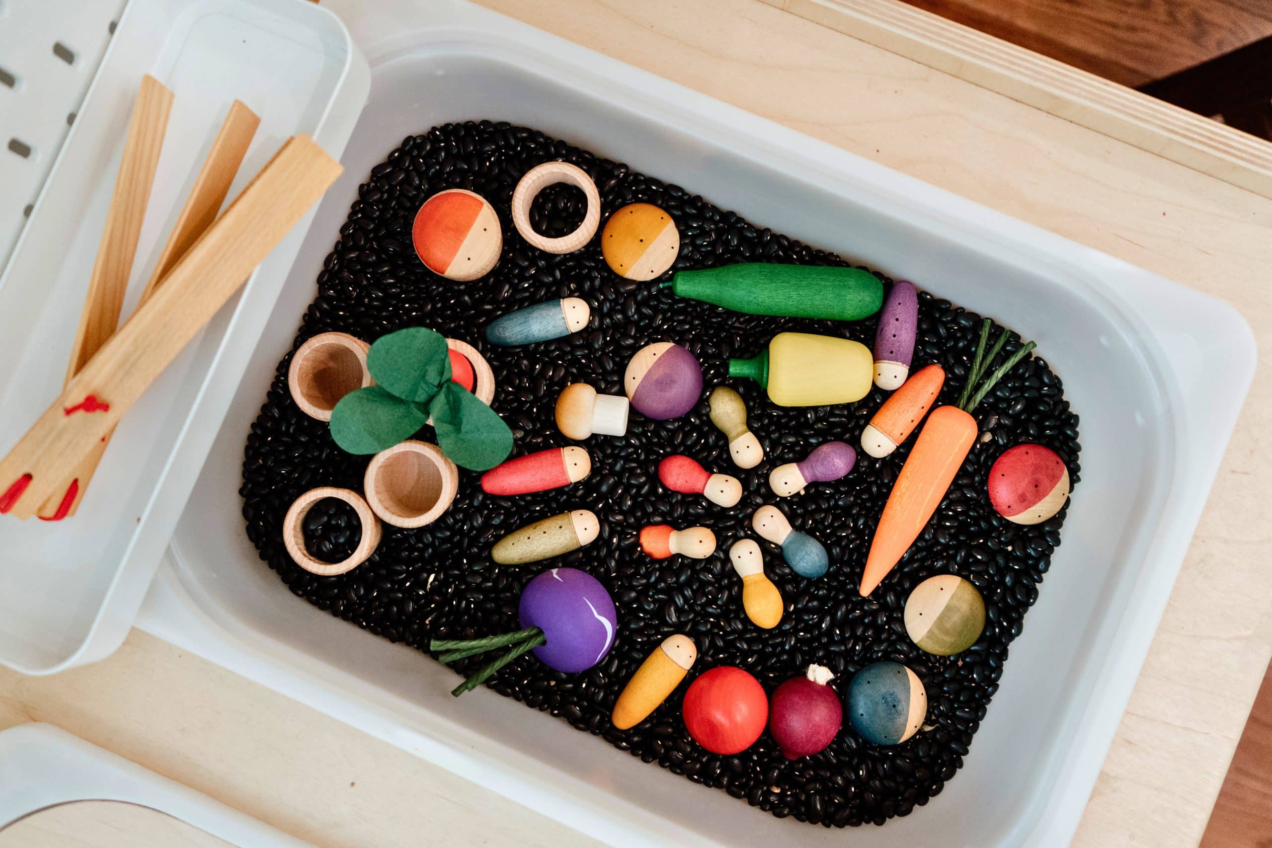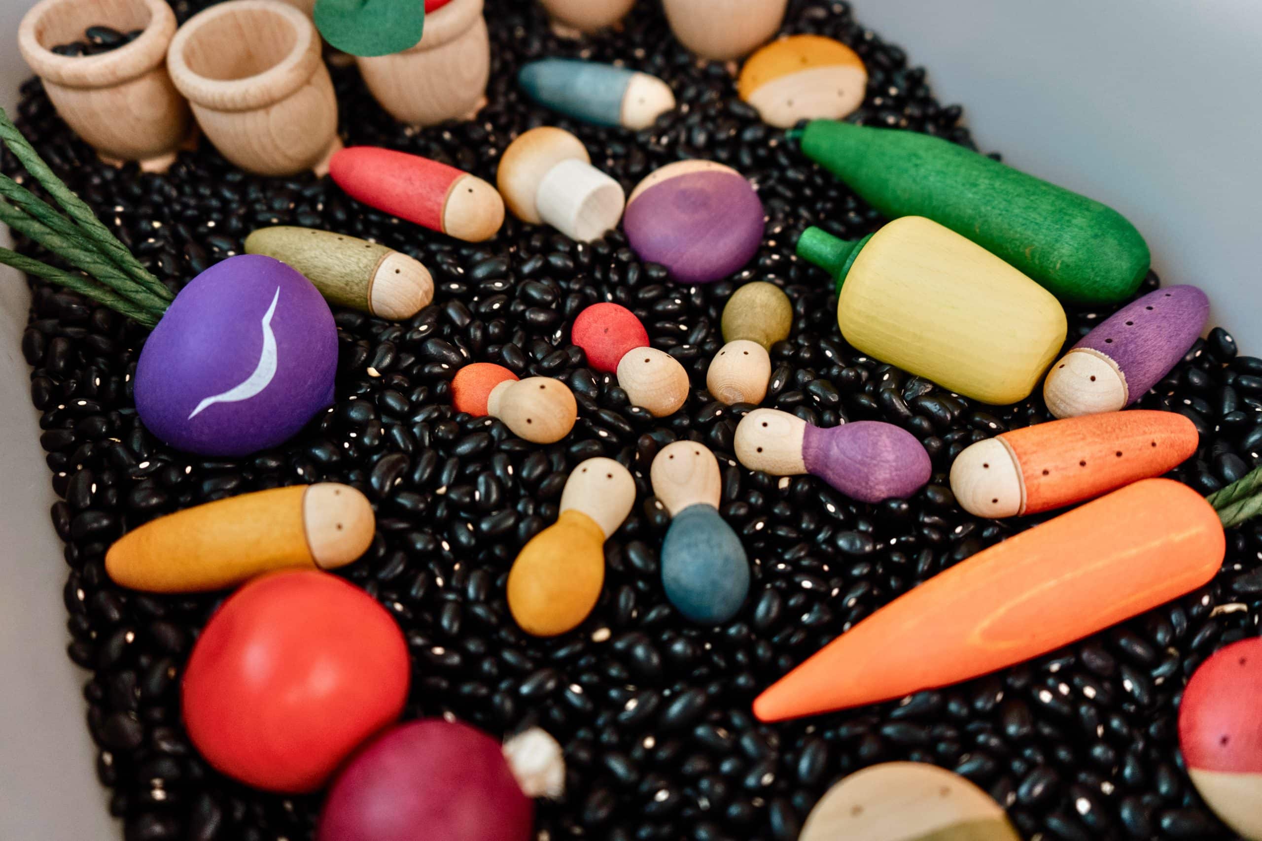 Que ce soit au printemps pour partir les semis, pendant l’été alors que tout se met à pousser, à fleurir et à pousser, ou encore à l’automne lors du temps des récoltes, le jardinage dans nos potagers est important pour nous. La terre nous nourrit et ce sont nos efforts mis dans nos potagers qui permettent de ressentir de la fierté d’avoir produit nous-mêmes nos légumes, pour ensuite les mettre dans nos assiettes! Quoi de plus satisfaisant que de cueillir un haricot à même le plant et en prendre une bonne bouchée, ou encore de sortir une carotte sucrée de la terre pour la manger sans même la laver! Ce coffret découverte nous ramène aux bénéfices du jardinage et de l’alimentation saine. C’est un bon moyen d’aborder les saines habitudes de vie, le cycle de la graine jusqu’au fruit/légume, l’importance des abeilles pour polliniser nos plants, etc. La symbiose entre la faune et la flore est tout aussi importante! Avec ce coffret découverte, les enfants pourront vivre les joies du jardinage et combien récolter ce qu’on a semé est dont valorisant! Tout le contenu est adapté pour être intégré dans un bac sensoriel. Imaginez chaque item ajouté dans un bac de haricots noirs et imaginez un vrai potager rempli de légumes prêts à être récoltés! En jeux de rôles, pour amener la nature dans nos locaux, pour éveiller aux sciences et à la découverte du monde autour de soi, le Coffret découverte – Jardinage (légumes) est un choix parfait!