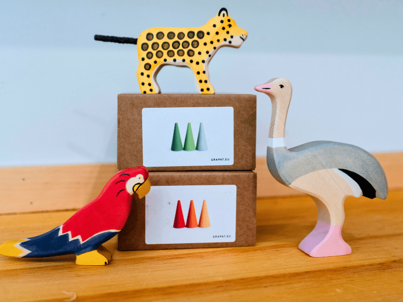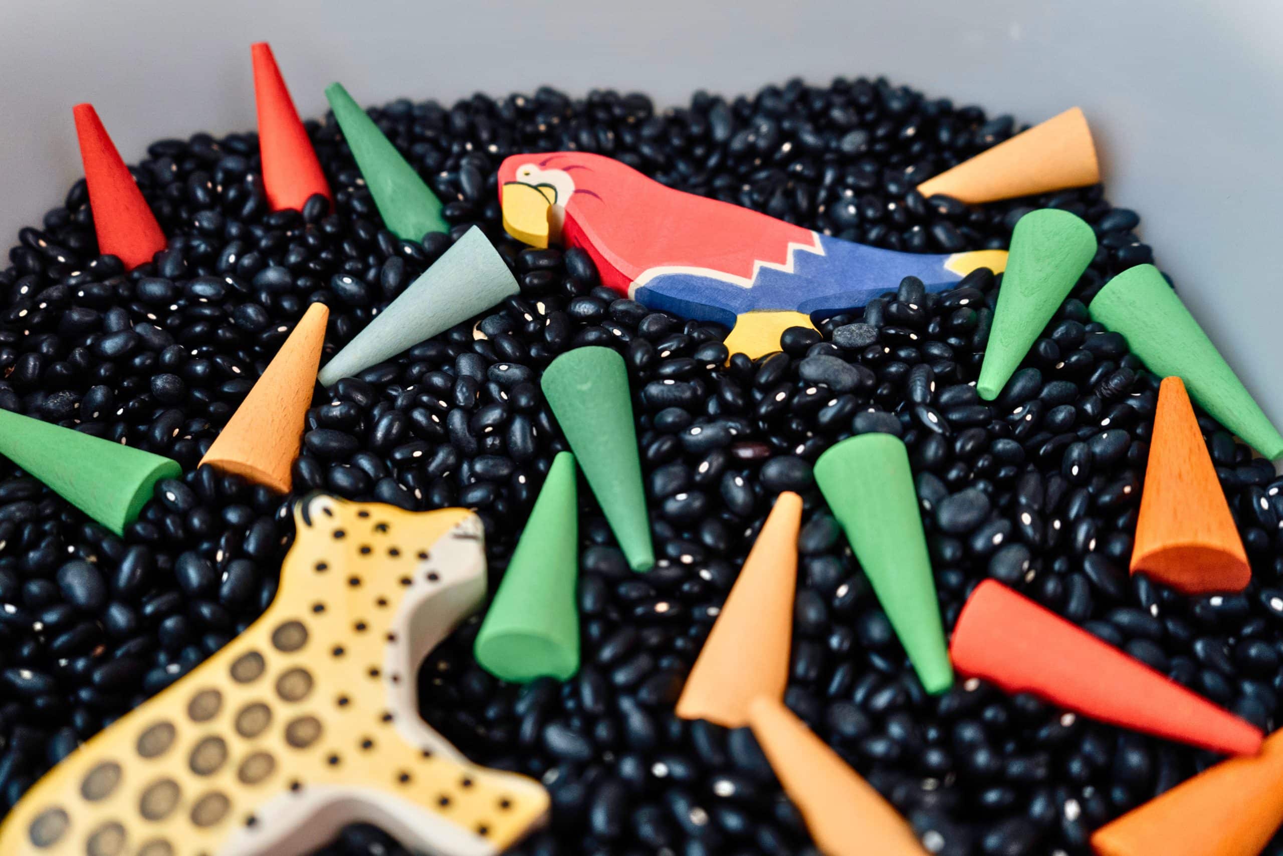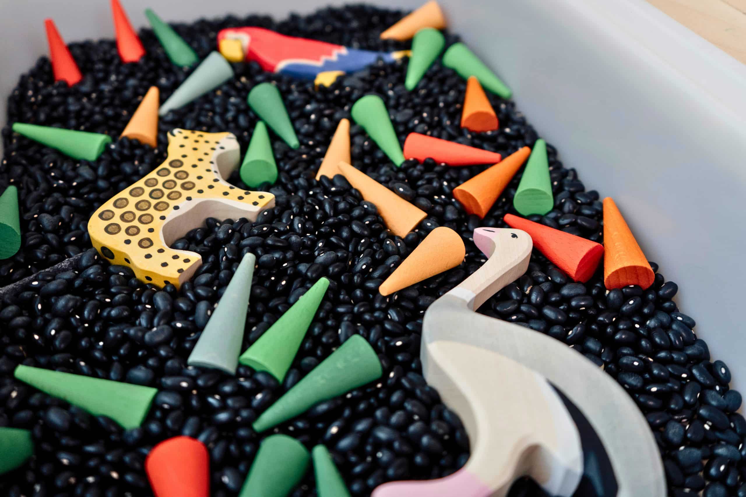 Nous avons créé ce coffret afin que son contenu puisse facilement être intégré dans un bac sensoriel. Imaginez ces jolis animaux dans un bac de lentilles, de haricots tachetés, ou de haricots verts, par exemple. Amusez-vous à les cacher, les enterrer, les faire tenir debout, les aligner, les classer en ordre de grandeur, etc. Prenez plaisir à attraper les petits cônes du bout des doigts ou avec une pince. Triez les cônes, placez-les dans des bols, servez-vous de ces « loose parts » pour créer des clôtures ou des bosquets.