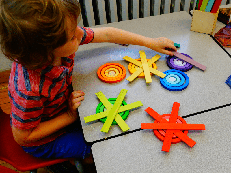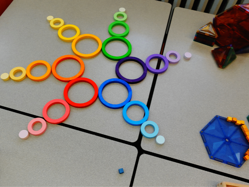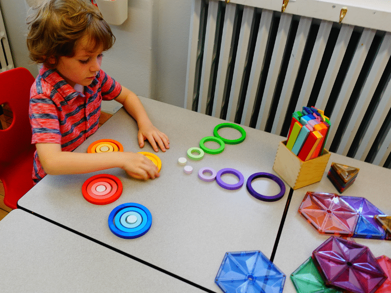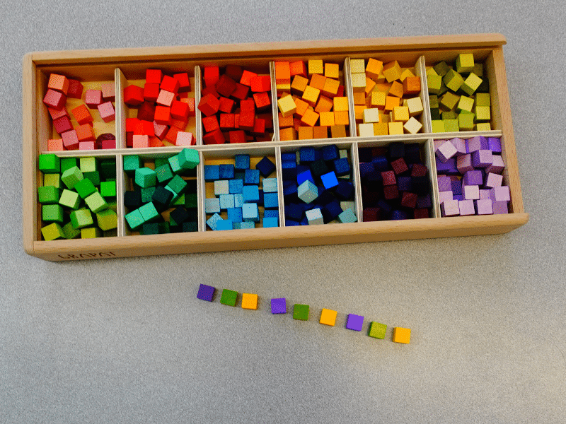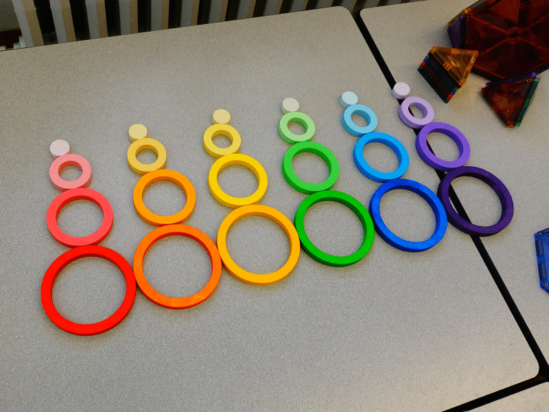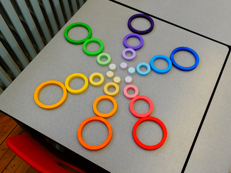 Utilisez les anneaux de nid et les cubes du « Mis and match » colorés pour classer par couleur, pour créer des ensembles ou en transformant le tout en diagramme de Venn. Enfilez les anneaux sur des cordes.