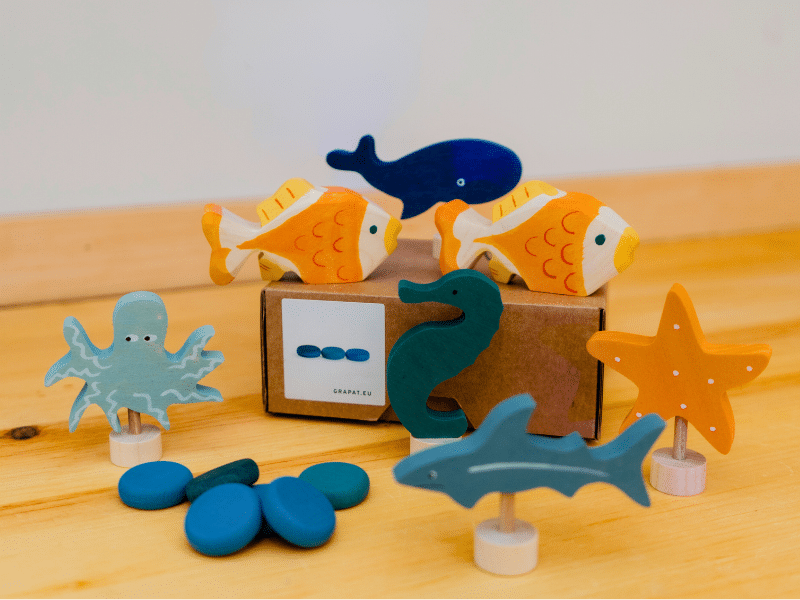 Grapat est une entreprise espagnole, située en Catalogne, qui a comme principal objectif de produire des jouets sans mode d’emploi qui sont libres et polyvalents. Leur conception invite et provoque d’elle-même la création de mondes fantastiques ou réalistes. Chaque pièce est unique; les artisans fabriquent chacune d’elles à la main en utilisant des colorants naturels qui laissent voir les veines du bois ainsi que des cires et huiles aux couleurs vives qui brillent légèrement. Le hêtre et le bouleau utilisés pour créer les jouets proviennent de forêts durables. Les sacs en tissu de certains produits proviennent de grandes entreprises qui jettent du matériel lorsqu’ils présentent un petit défaut. Comme Grapat produit les sacs à la main, ils peuvent en tirer parti en supprimant ces défauts et en leur donnant une seconde vie. Les tissus varient et ne correspondent pas aux photos des produits. Depuis 2019, l’entreprise a éliminé à 100 % l’utilisation de plastique dans leurs emballages.