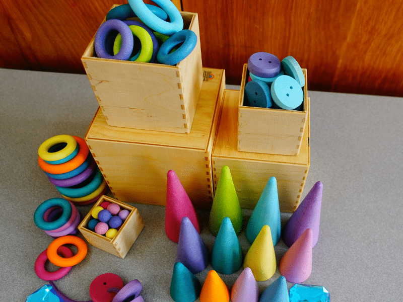 Que vous soyez initiés ou débutants avec le matériel polyvalent, ce coffret est parfait pour un groupe qui souhaite utiliser les pièces détachées à proprement parler. Amusez-vous à trier les pièces détachées, à les mettre dans les différentes boîtes, à sentir les différentes textures et à explorer les bruits quelles font en tombant dedans. Intégrez-les dans vos construction, mettez-les dans des bols en guise de nourriture, créez tout un monde imaginaire et laissez-vous transporter dans l’univers du jeu libre! Les pierres scintillantes ajoutent de la brillance et permettent les jeux de lumière. Avouez que les couleurs sont plus que magnifiques!