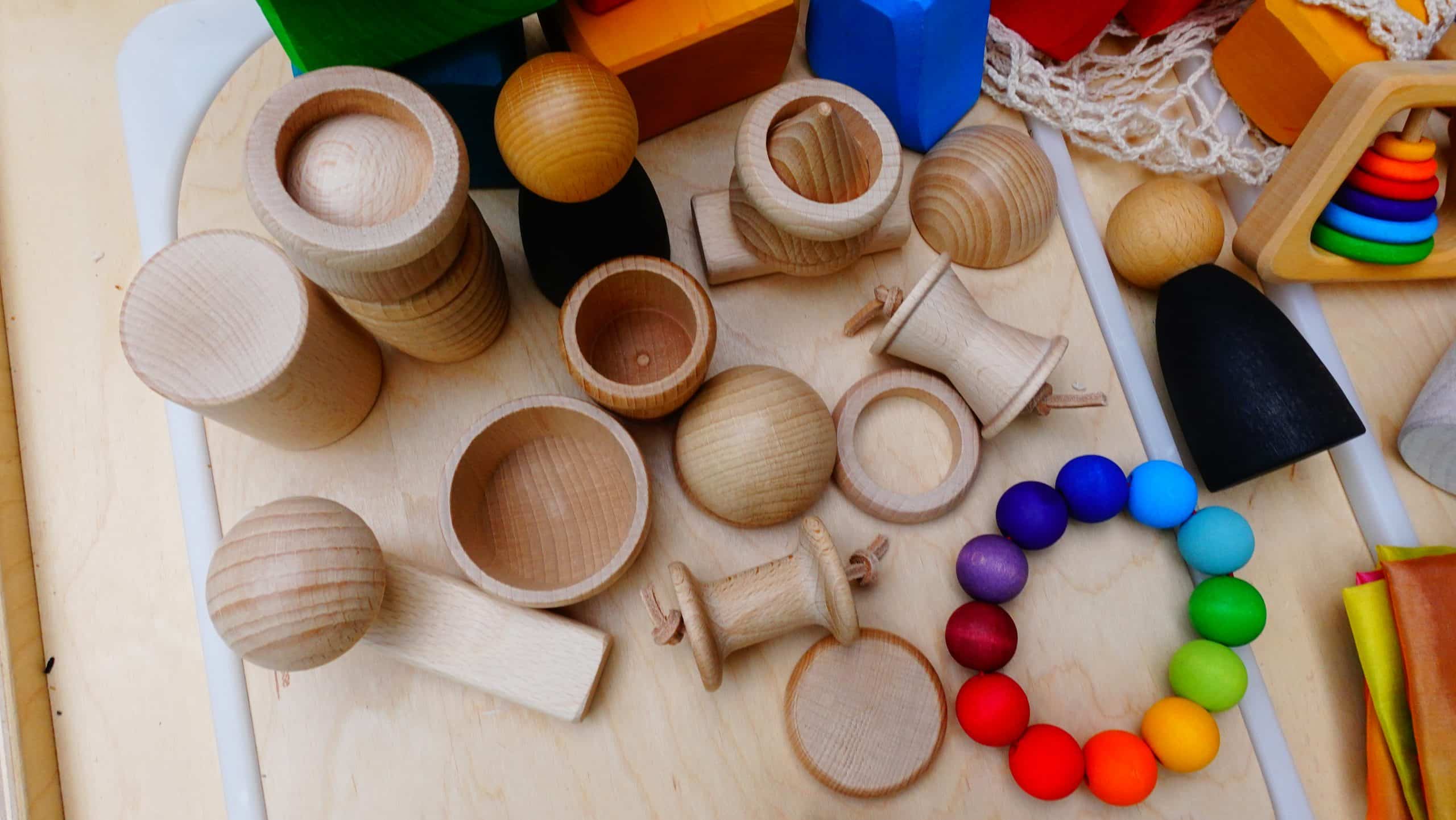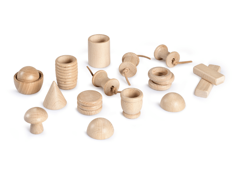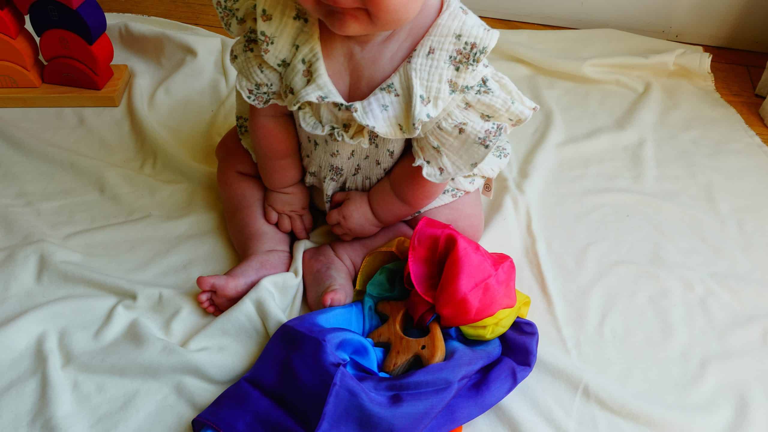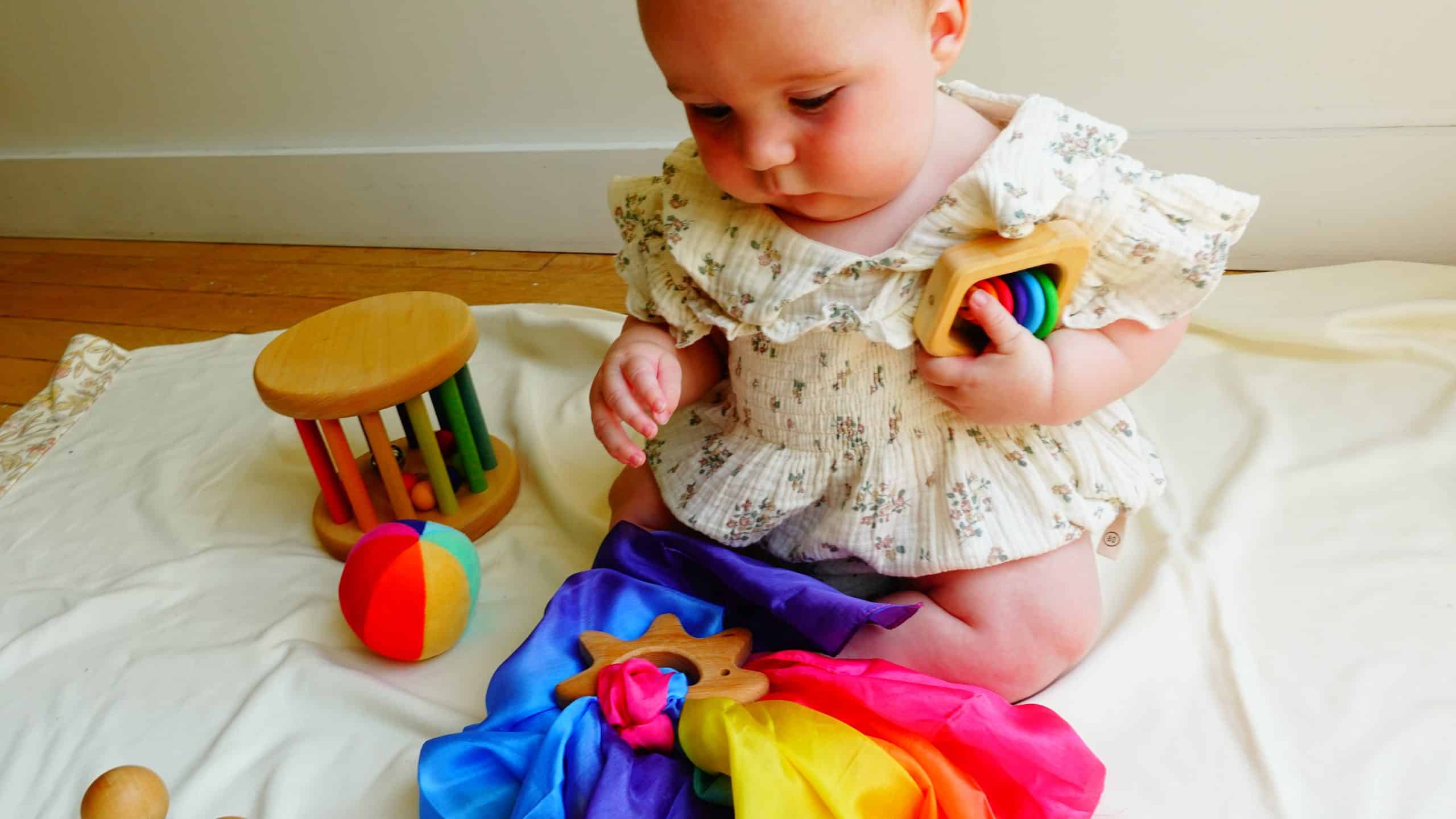 Au niveau sensoriel, le bébé pourra découvrir plusieurs textures différentes: le bois dur et lisse des blocs et des personnages, les formes arrondies de la roue, de la balle et de l’anneau de perles, la dureté du bois et la douceur de la balle arc-en-ciel si moelleuse, etc. La roue roulante offre du mouvement, des textures et une sonorité qui sont appréciés des poupons. Elle leur donnera sans doute envie de la toucher, de la secouer ou d’aller l’attraper pour qu’elle se remette en mouvement, qu’elle tourne sur le plancher ou encore qu’elle fasse tinter son grelot et ses billes de bois! Les pots et bols pourront servir à accueillir tous les petits trésors que les enfants trouveront. Ils s’amuseront sans doute à jouer à mettre « dedans » et ensuite à tout vider sur le plancher, créant des sons qui leur donneront envie de recommencer! Les contenants placés à l’envers permettront à l’adulte de cacher des choses en-dessous, afin de s’amuser avec la permanence de l’objet. Les blocs et les contenants pourront être empilés pour jouer avec l’équilibre et créer des tours. Qui n’a pas pris plaisir, enfant, à faire tomber une pile de blocs au compte de 3? C’est un plaisir coupable de la petite enfance!