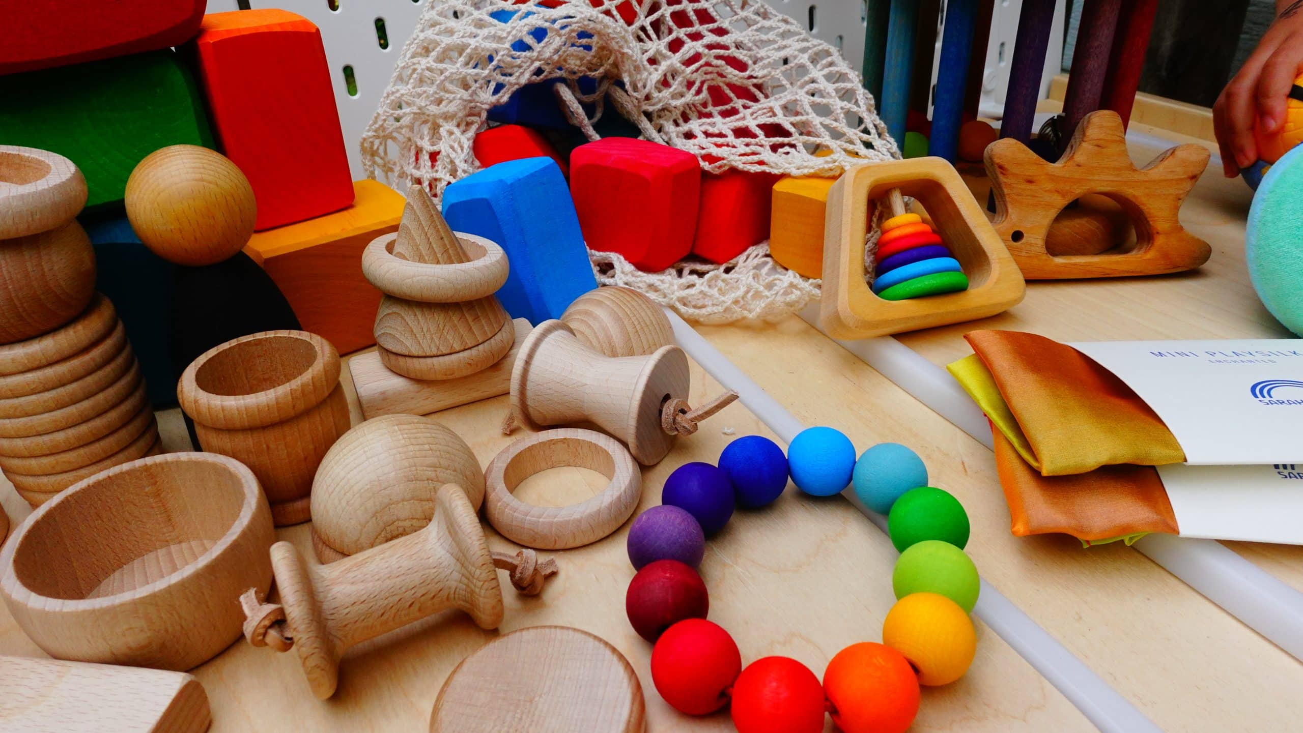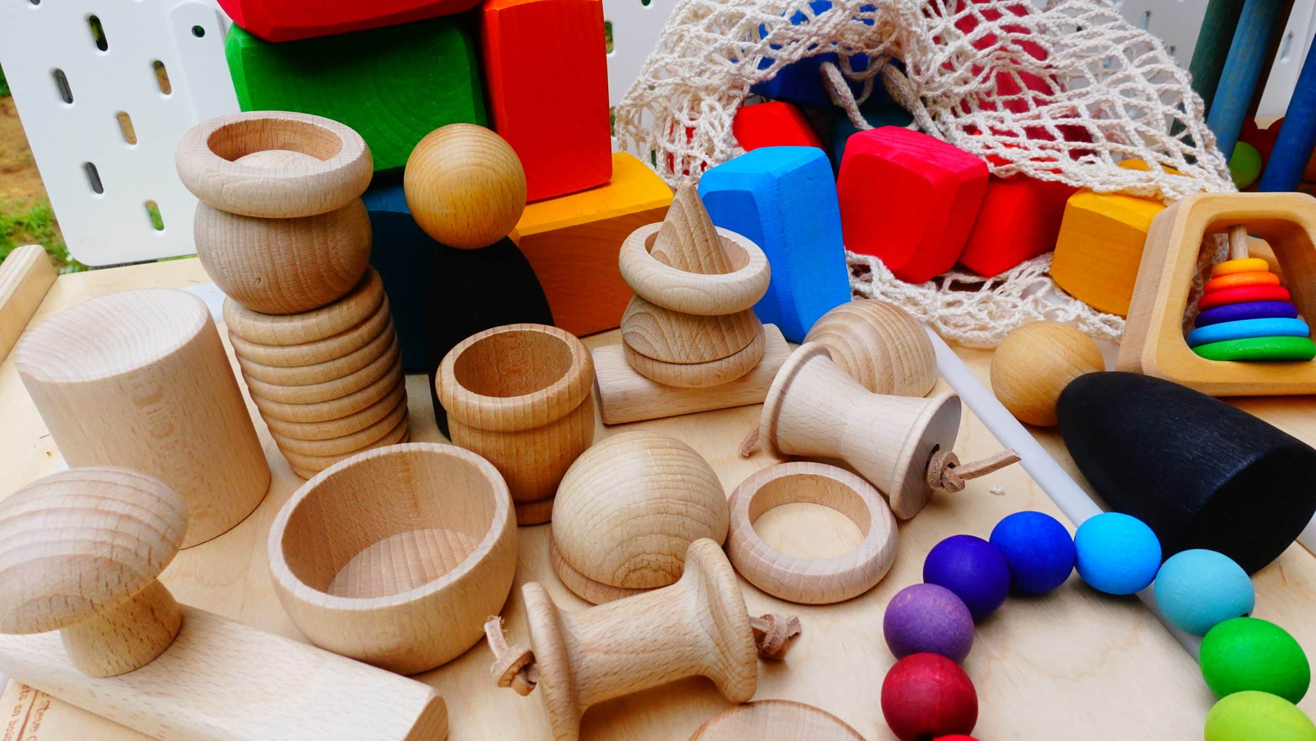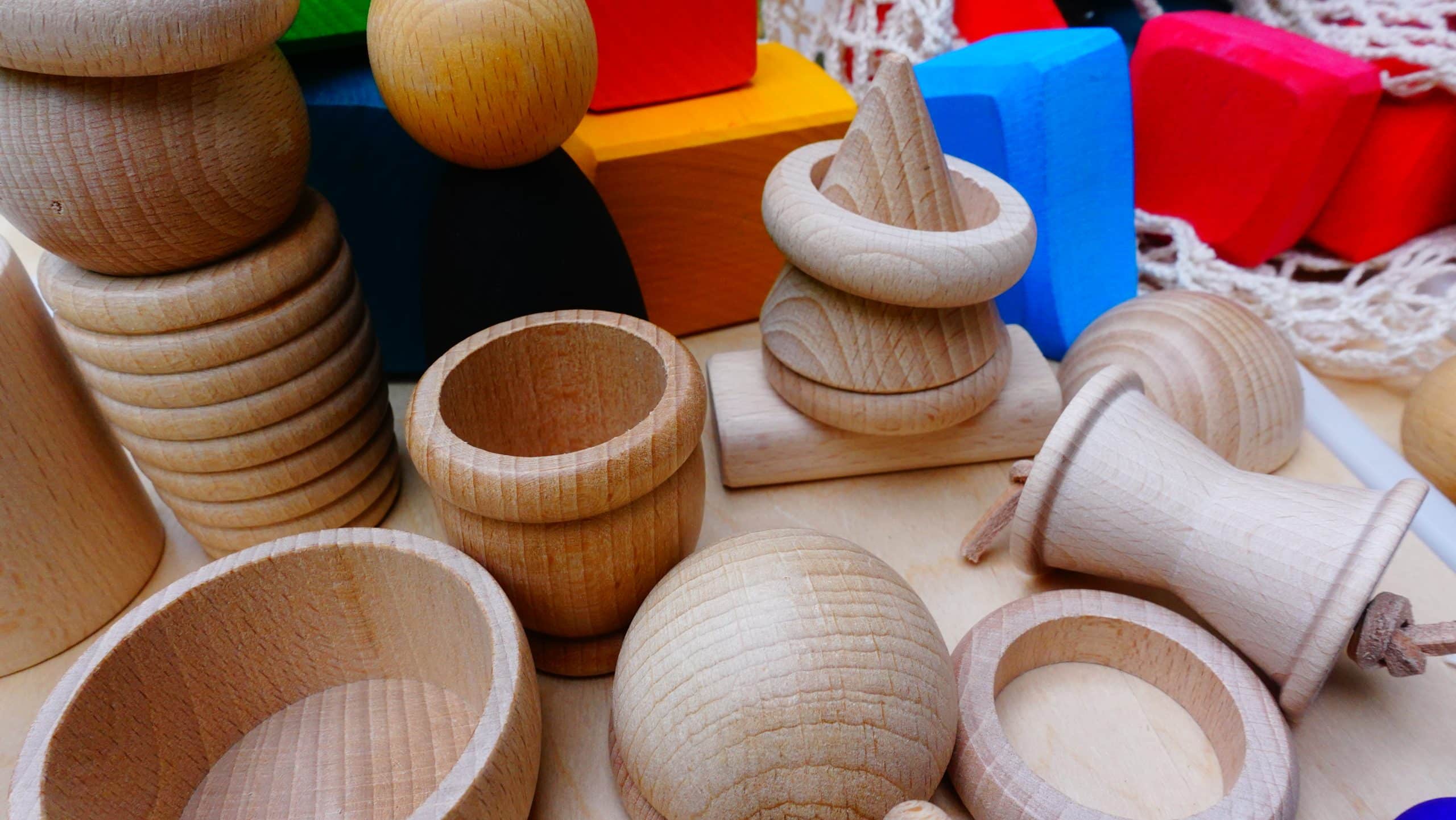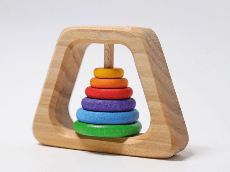 Au niveau sensoriel, le bébé pourra découvrir plusieurs textures différentes: le bois dur et lisse des blocs et des personnages, les formes arrondies de la roue, de la balle et de l’anneau de perles, la dureté du bois et la douceur de la balle arc-en-ciel si moelleuse, etc. La roue roulante offre du mouvement, des textures et une sonorité qui sont appréciés des poupons. Elle leur donnera sans doute envie de la toucher, de la secouer ou d’aller l’attraper pour qu’elle se remette en mouvement, qu’elle tourne sur le plancher ou encore qu’elle fasse tinter son grelot et ses billes de bois! Les pots et bols pourront servir à accueillir tous les petits trésors que les enfants trouveront. Ils s’amuseront sans doute à jouer à mettre « dedans » et ensuite à tout vider sur le plancher, créant des sons qui leur donneront envie de recommencer! Les contenants placés à l’envers permettront à l’adulte de cacher des choses en-dessous, afin de s’amuser avec la permanence de l’objet. Les blocs et les contenants pourront être empilés pour jouer avec l’équilibre et créer des tours. Qui n’a pas pris plaisir, enfant, à faire tomber une pile de blocs au compte de 3? C’est un plaisir coupable de la petite enfance!