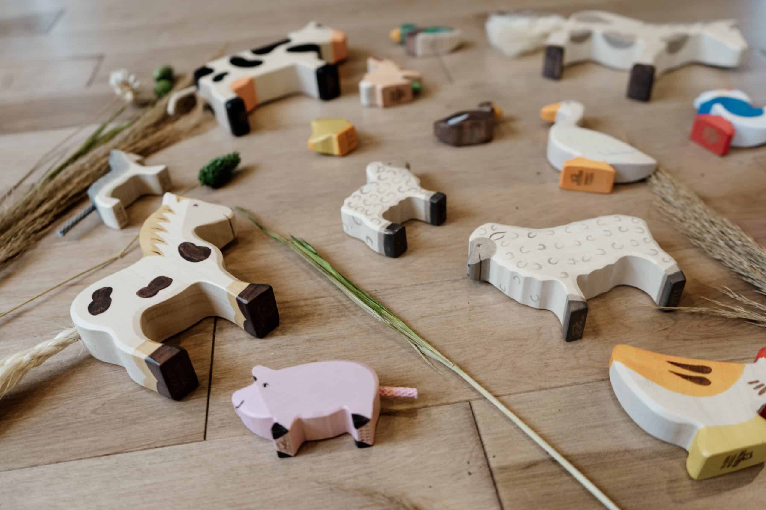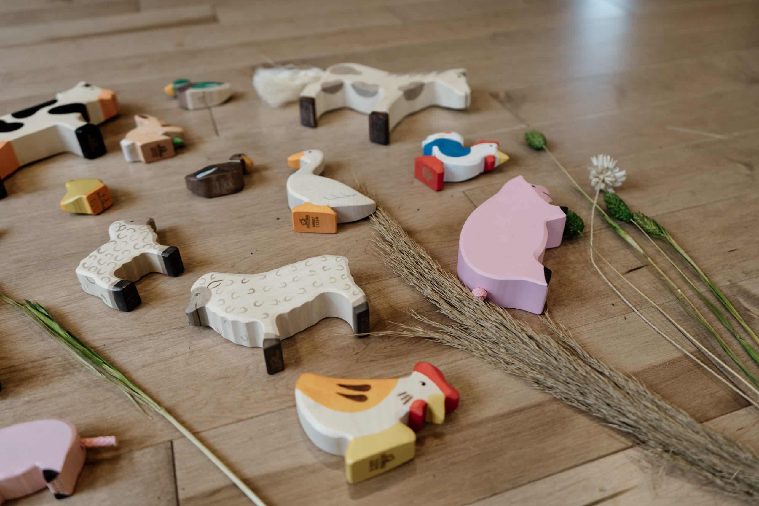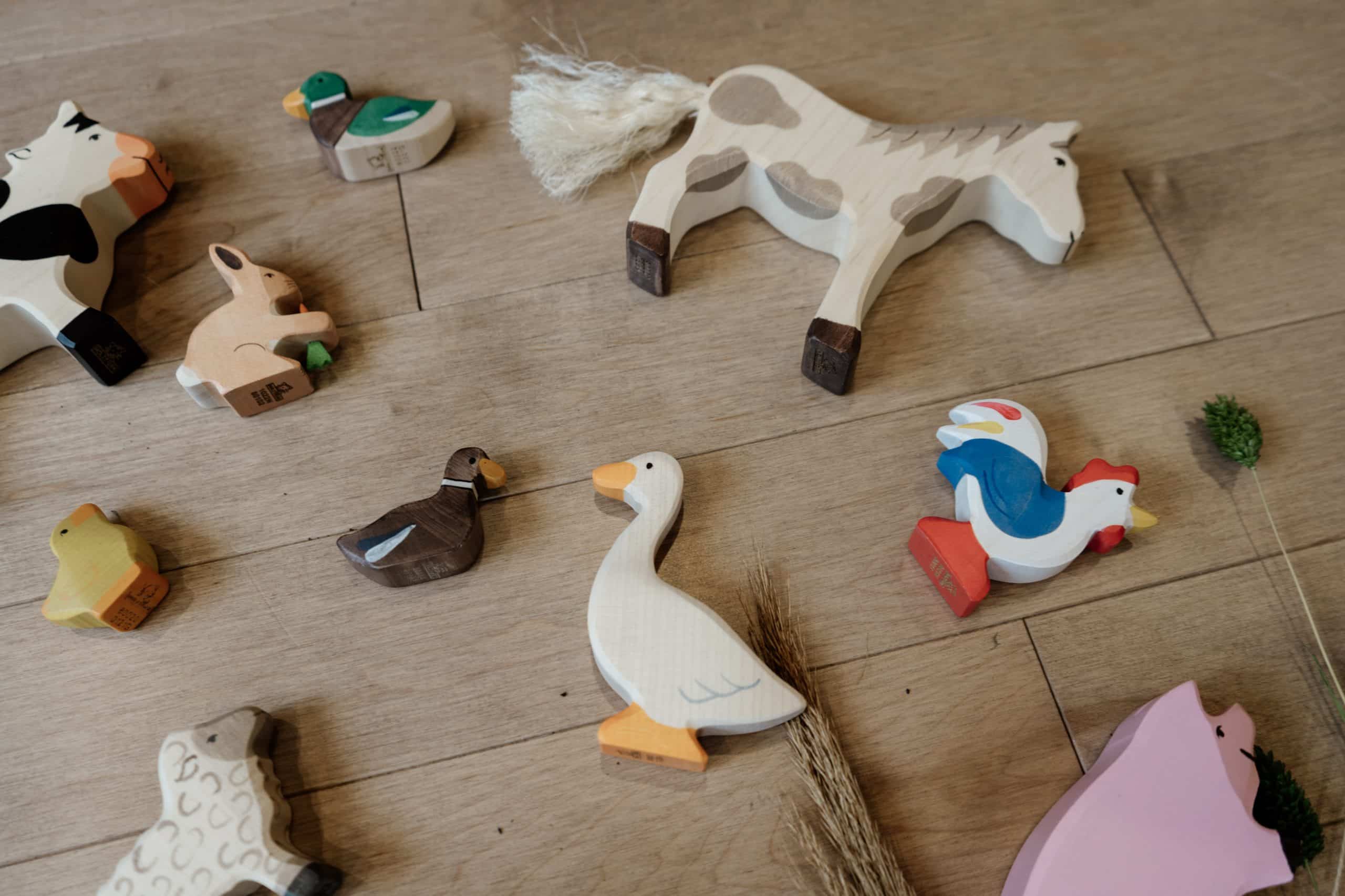 Ce coffret de figurines en bois Holztiger contient 16 animaux de la ferme: cheval tacheté, poney, dalmatien, chat, agneau, mouton, oie, canard colvert, canard brun, coq, poule, poussin, vache, cochon, porcelet et lièvre avec sa carotte!