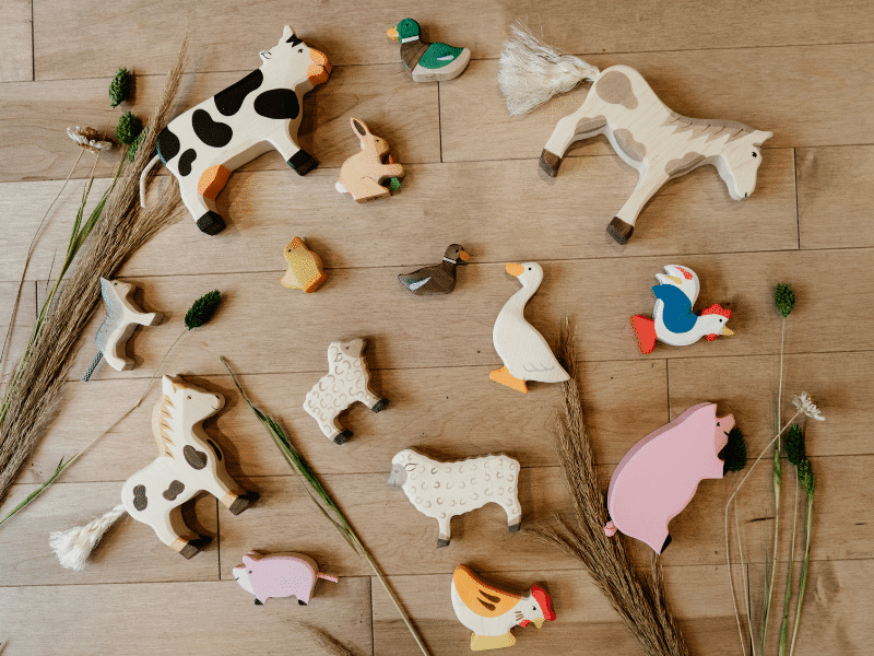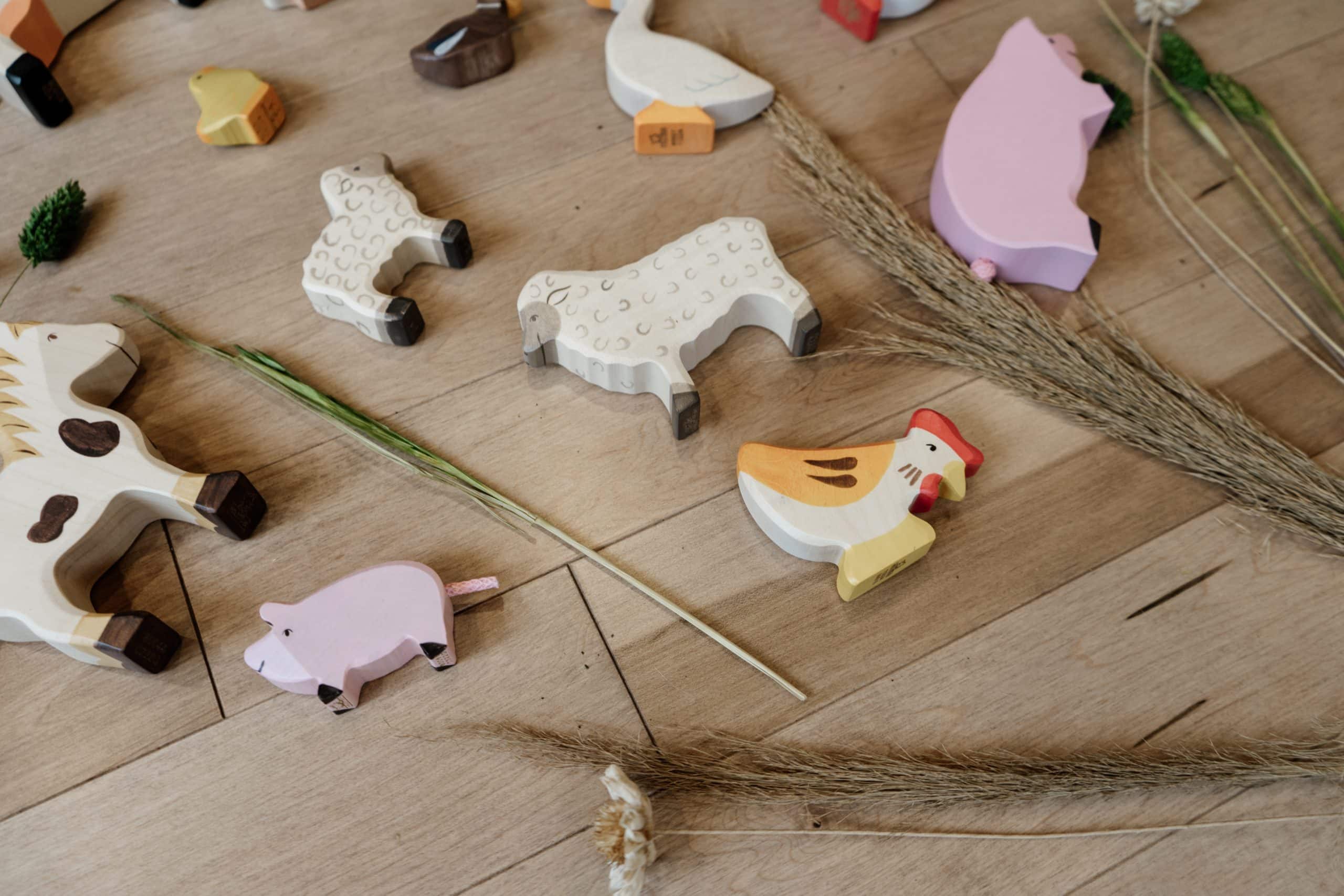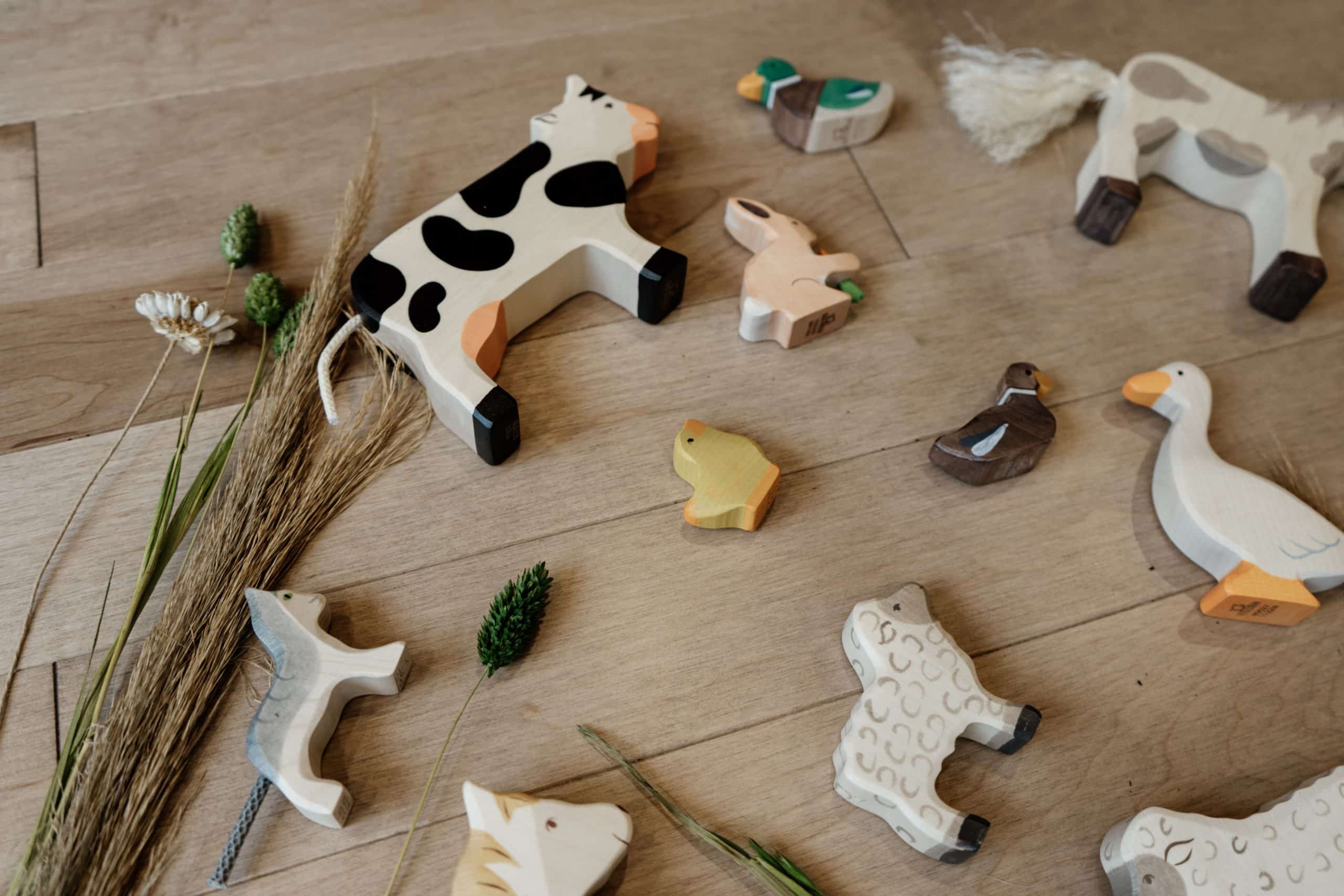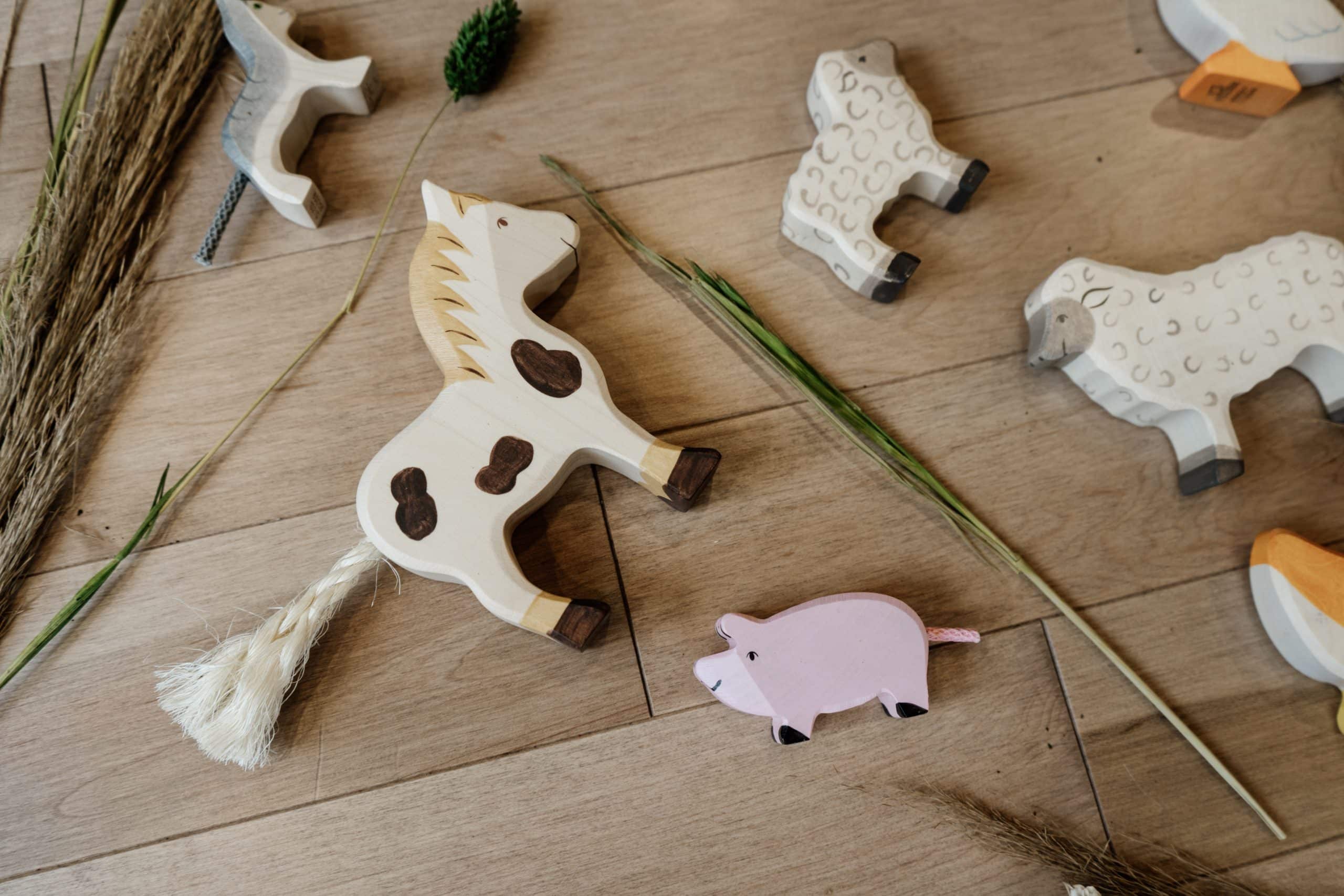 Ce coffret de figurines en bois Holztiger contient 16 animaux de la ferme: cheval tacheté, poney, dalmatien, chat, agneau, mouton, oie, canard colvert, canard brun, coq, poule, poussin, vache, cochon, porcelet et lièvre avec sa carotte!