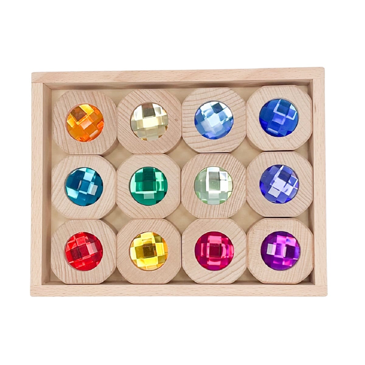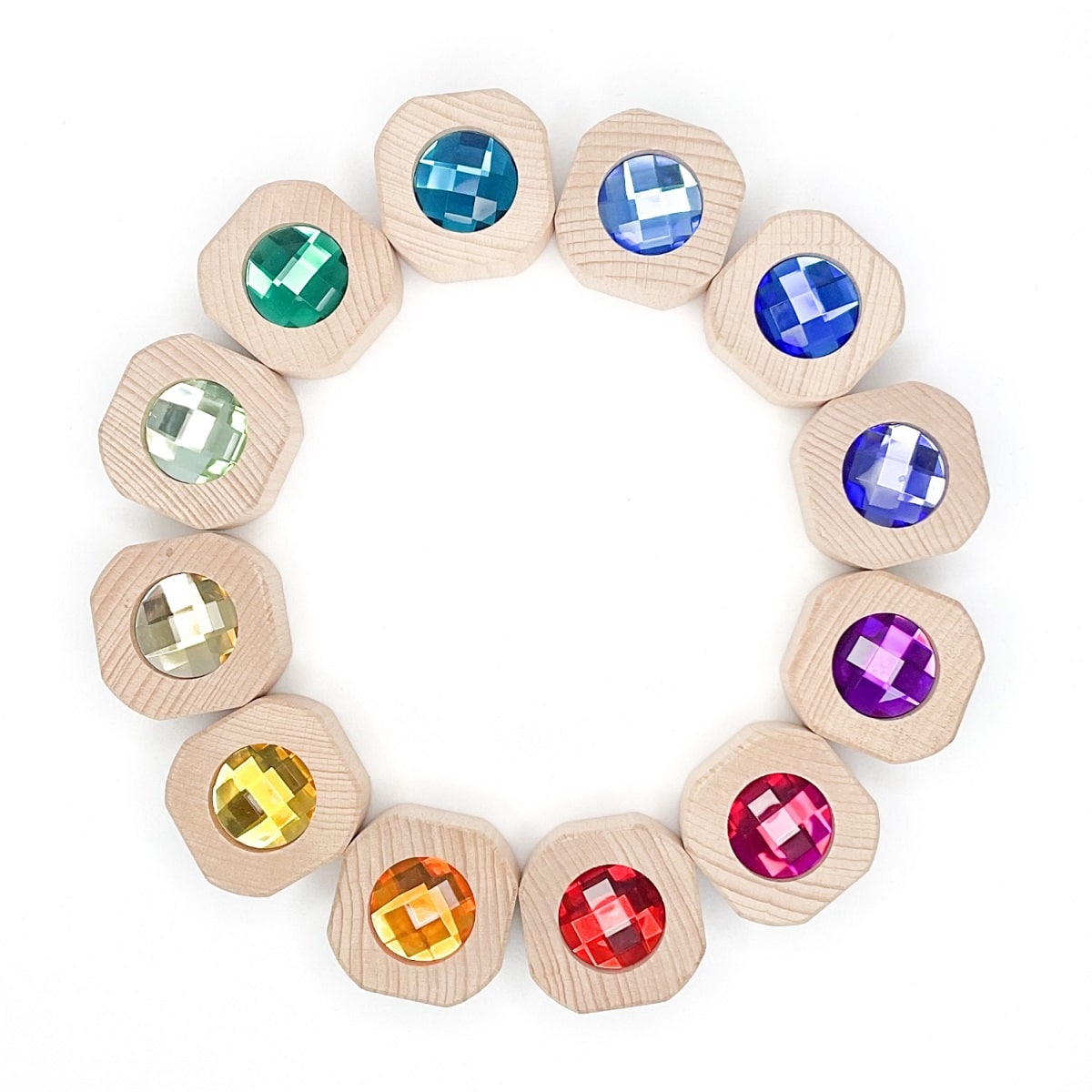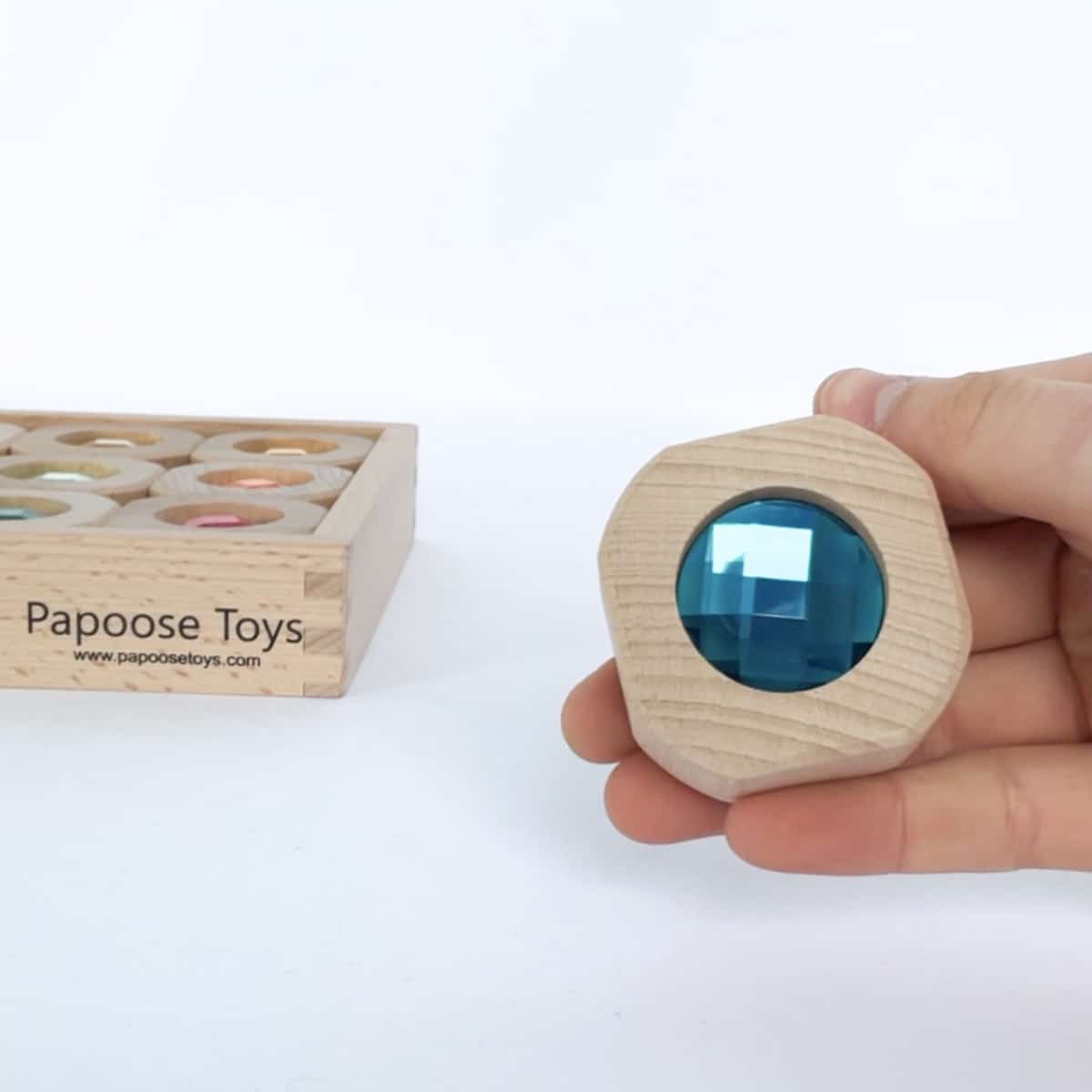 Cet ensemble de 12 diamants représentent les couleurs de Goethe. Dans chaque bloc en bois est inséré un diamant, ou selon le vrai terme, une gemme. Une gemme est une pierre précieuse opaque, ce qui signifie qu’elle n’est pas transparente. Ces blocs Papoose sont une façon amusante d’explorer les couleurs de Goethe. Amusez-vous sous les rayons du soleil et regardez-les scintiller… Cet ensemble est présenté dans un magnifique plateau en bois.