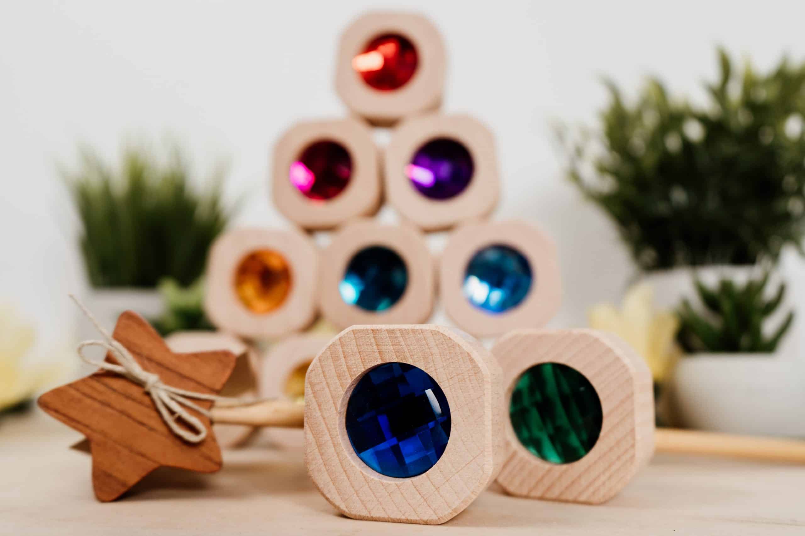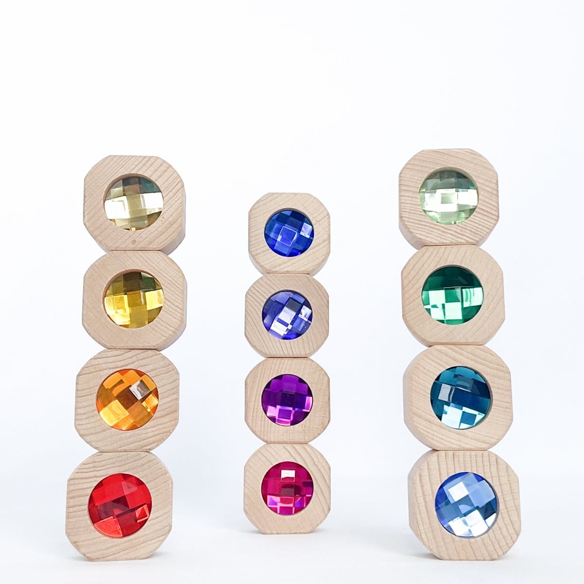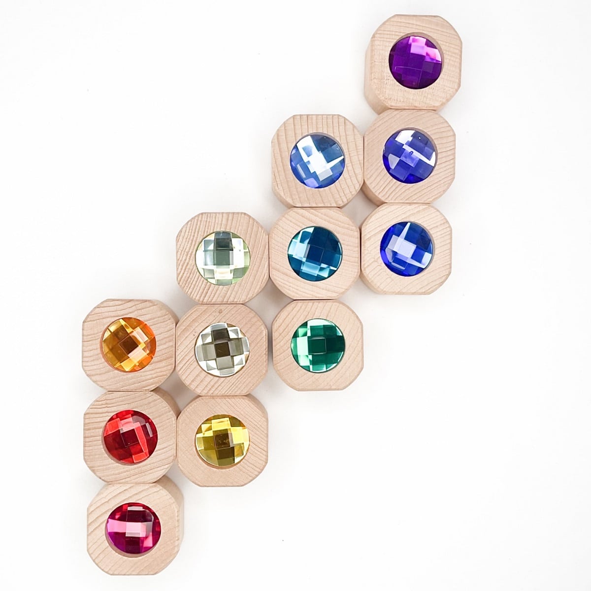 Cet ensemble de 12 diamants représentent les couleurs de Goethe. Dans chaque bloc en bois est inséré un diamant, ou selon le vrai terme, une gemme. Une gemme est une pierre précieuse opaque, ce qui signifie qu’elle n’est pas transparente. Ces blocs Papoose sont une façon amusante d’explorer les couleurs de Goethe. Amusez-vous sous les rayons du soleil et regardez-les scintiller… Cet ensemble est présenté dans un magnifique plateau en bois.