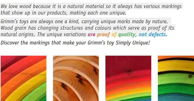 Les jouets Grimm’s sont conçus en fonction du jeu libre et polyvalent. Tous les jouets Grimm’s sont ouverts et sans mode d’emploi pour un jeu aux possibilités infinies. L’atelier de l’entreprise est situé en Allemagne. Pour Grimm’s, le sens du mot ‘’durable’’ ne se simplifie pas à sa définition première, soit ‘’qui dure longtemps’’. Grimm’s joint le mot durable au mot conception pour obtenir ‘’conception durable’’. Ainsi, les jouets sont non seulement durables de par leur matériau, mais aussi de par leur conception, c’est-à-dire que le design n’est pas affecté par les modes éphémères permettant au jouet d’être réellement durable dans son ensemble.