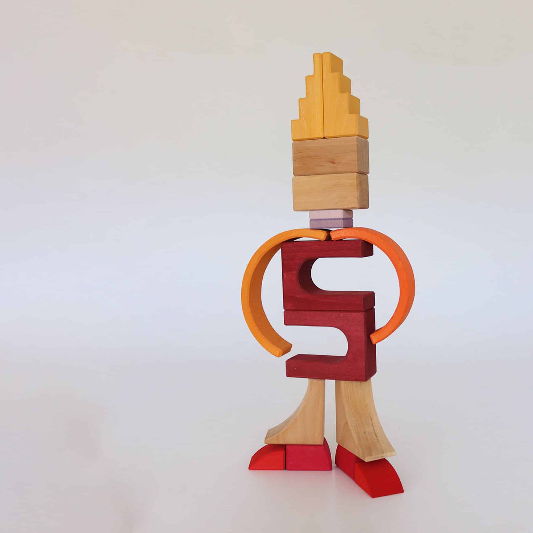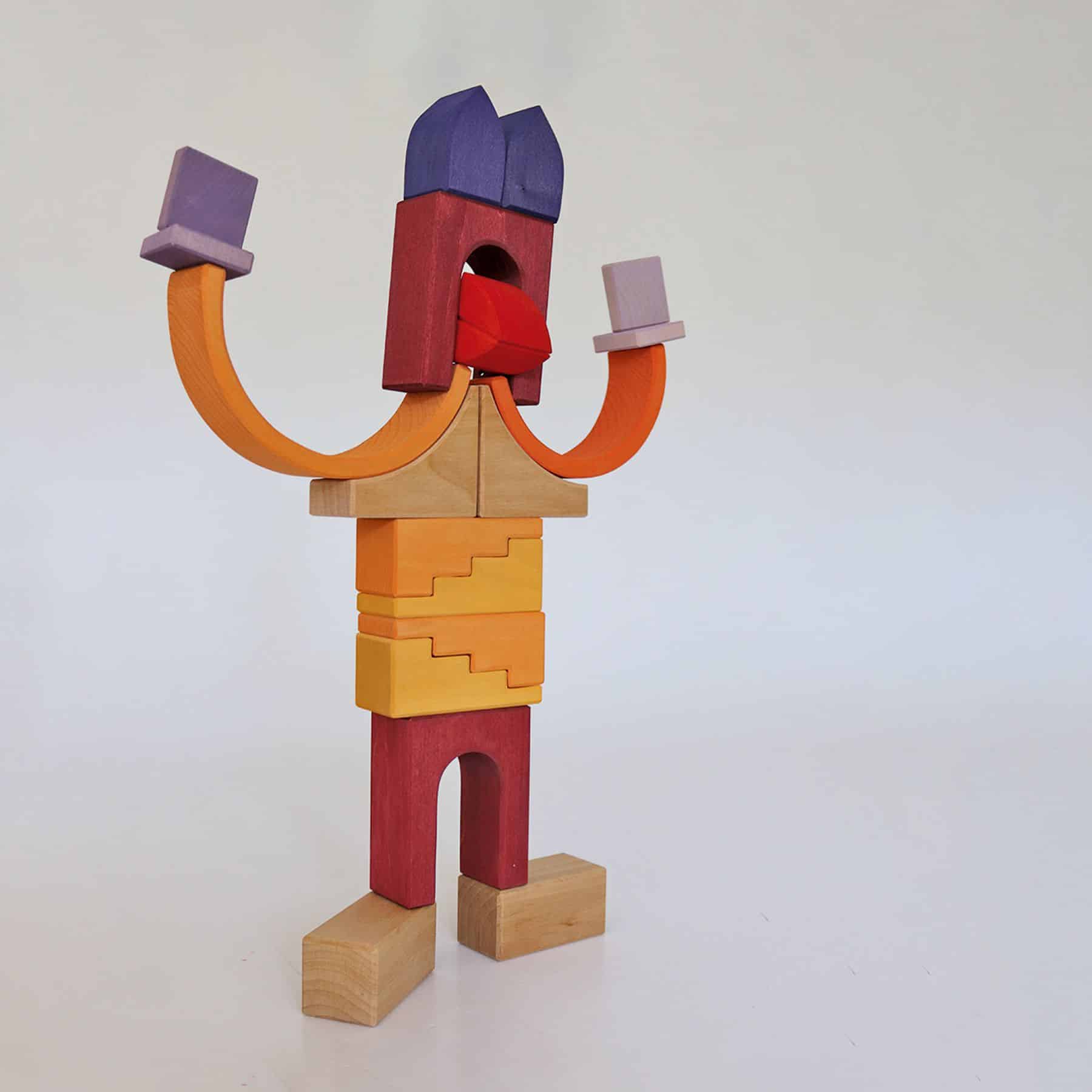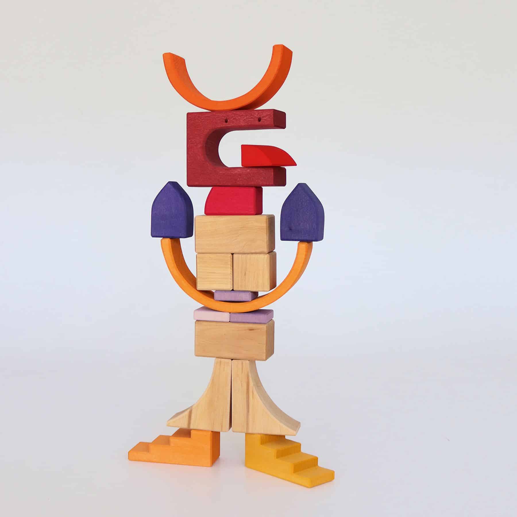 Contient 30 morceaux: 26 blocs, 2 personnages, 1 corde et 1 plateau en bois