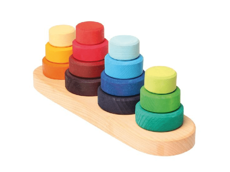 Avec ces quatre tours à empiler de Grimm’s, les enfants peuvent trier, empiler et construire. Lorsqu’ils empilent, la coordination œil-main est stimulée et la motricité fine se développe. Deux tours comportent trois disques et les deux autres tours en comportent quatre.