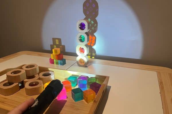 Avec la lumière, on peut jumeler les jouets ouverts et polyvalents pour créer quelque chose de dynamique. Certains jouets ont la beauté d’être translucides, comme certains blocs ou diamants colorés. En jumelant ce matériel avec une source lumineuse, on vient leur donner une deuxième dimension. Et c’est là où la magie opère !