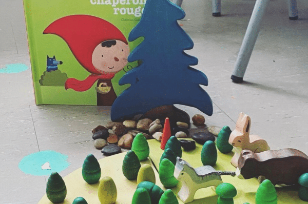 Le matériel polyvalent permet d’approfondir et de valider la compréhension de l’histoire. Lorsque l’enfant utilise le matériel afin de raconter une histoire lue ou connue, il démontre les éléments importants du récit qu’il a retenu. Les blocs de bois deviendront des maisons, des ponts, des châteaux… Les boutons bleus représenteront l’eau, les bouchons de lièges des personnages, le bout de tissu rouge du feu… Bref, l’imaginaire permet aux enfants de transformer du matériel varié, en un univers représentant le récit. Durant cette activité, les enfants verbalisent et structurent leurs idées permettant ainsi de travailler le français oral.